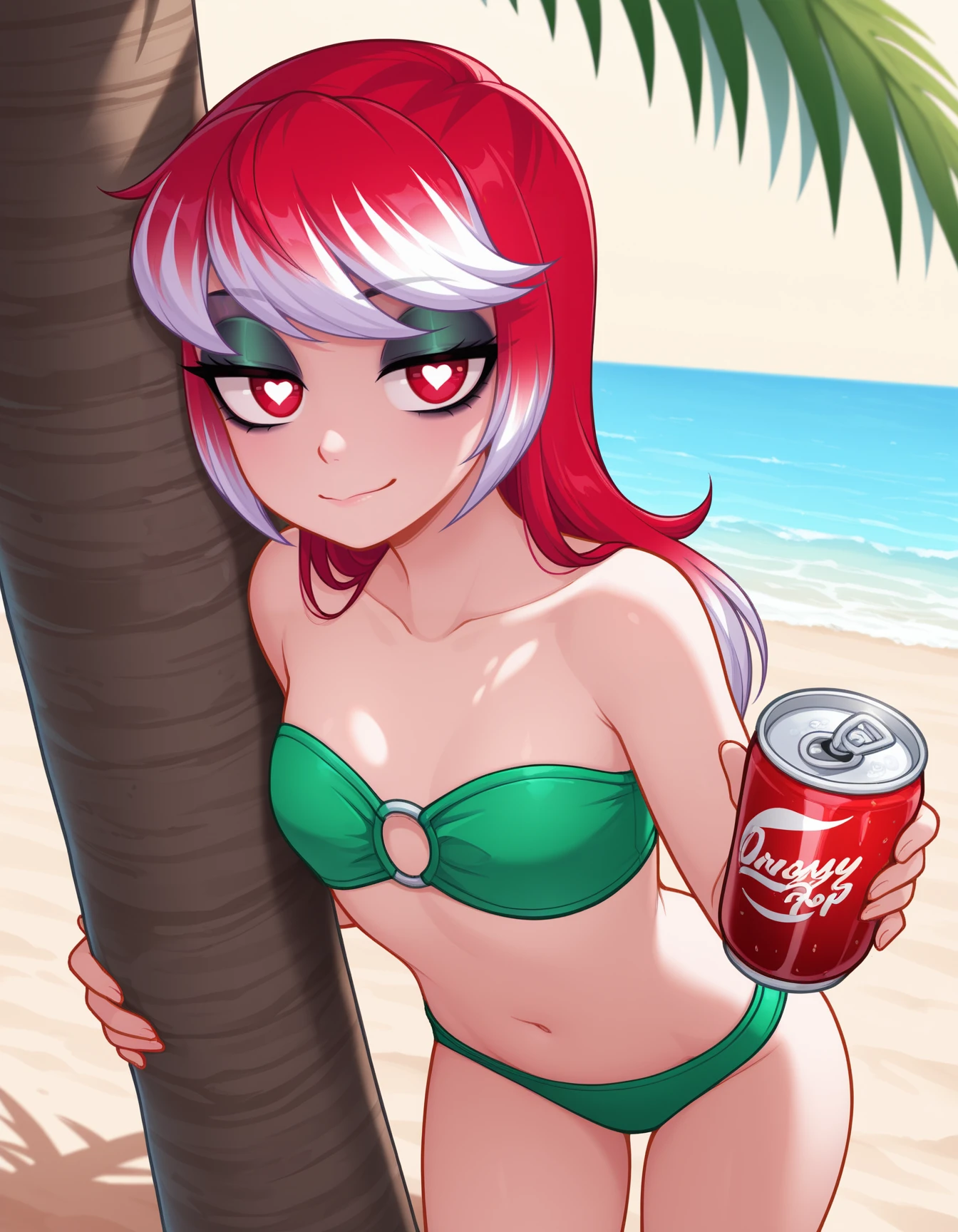 1girl, audreybelrosehuniepop, red eyes, white pupils, bright pupils, heart-shaped pupils, half-closed eyes, eyeshadow, red hair, two-tone hair, white hair, swept bangs, long hair, gradient hair, small ,