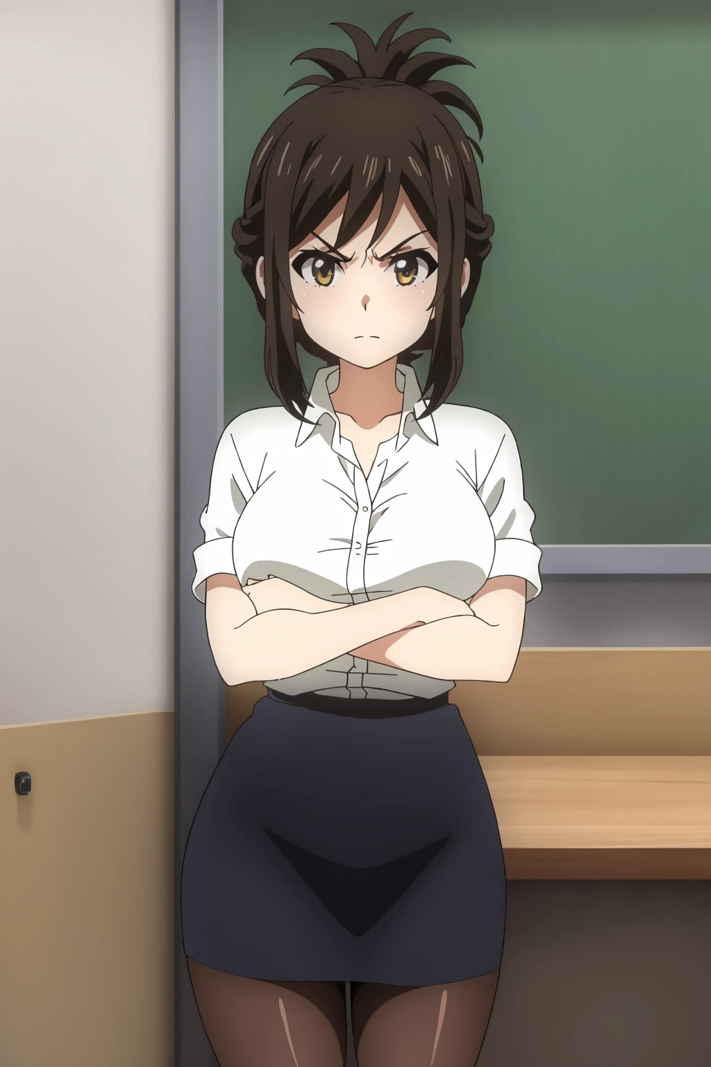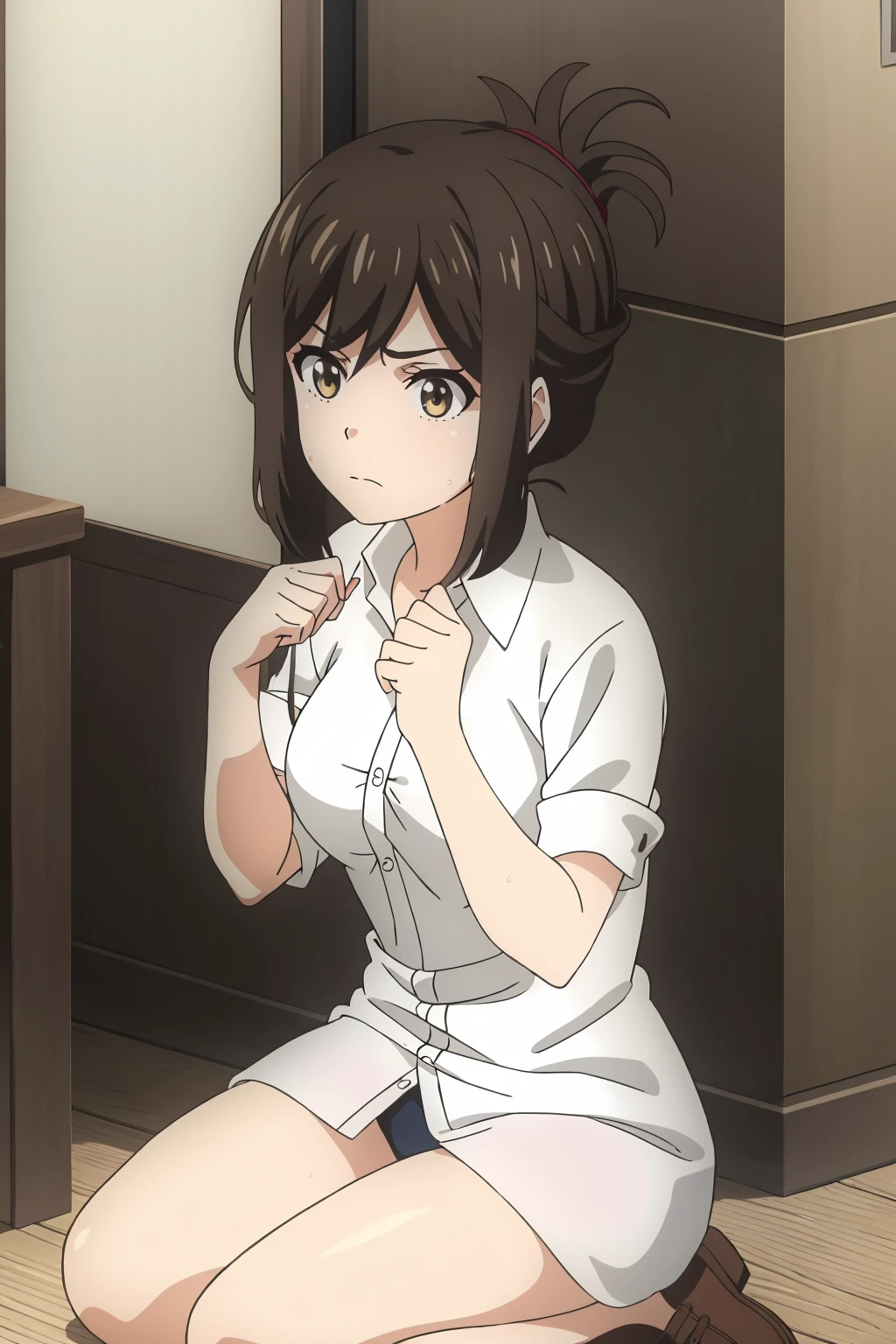 Kana, brown hair, brown eyes, bangs, sidelocks, folded ponytail, short hair, hair up, hair between eyes,