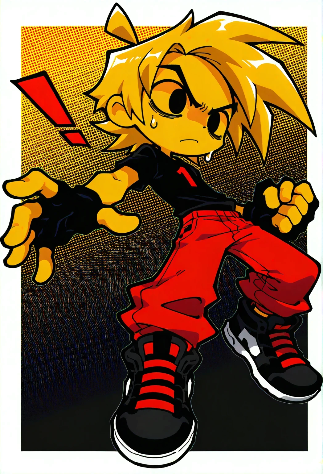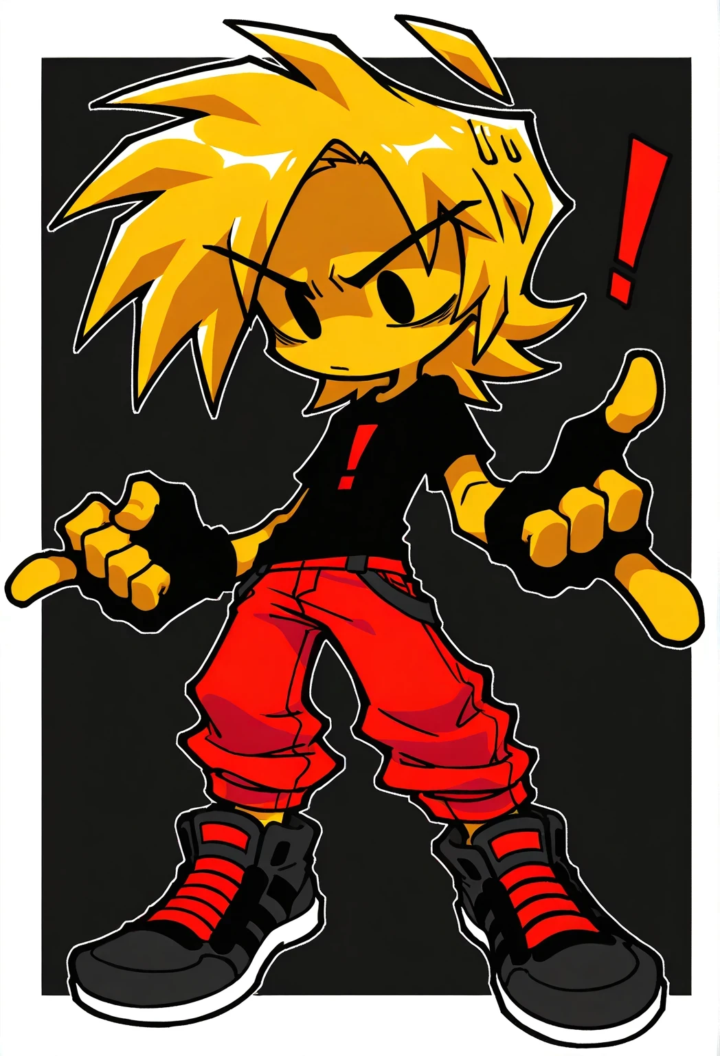 MinusGoldenBFfnfMinus, 1boy, spiky golden hair, black eyes, no sclera, vibrant red pants, golden skin, black-gray shirt with a red exclamation mark symbol, black-gray shoes with red laces, black fingerless gloves, short, chibi