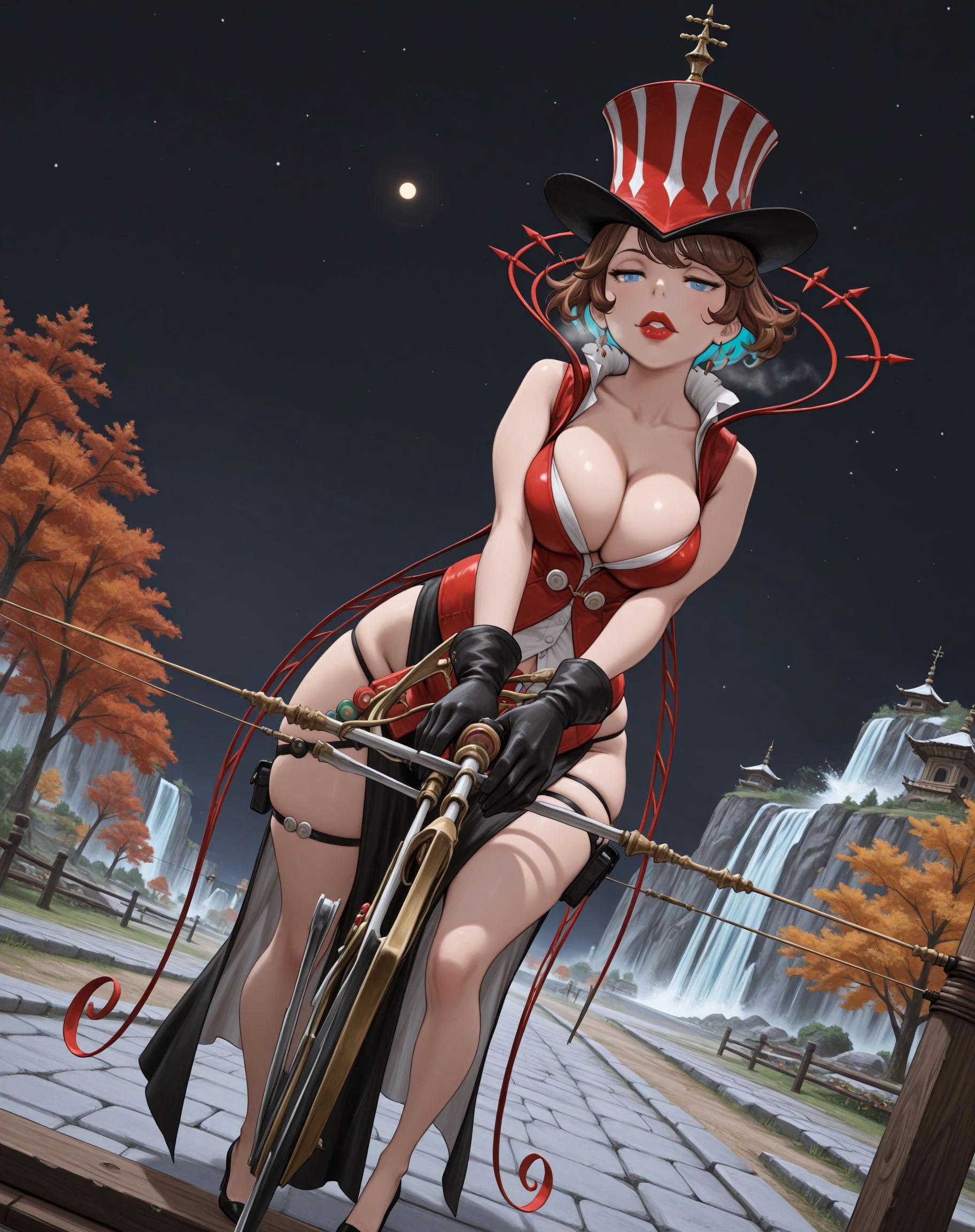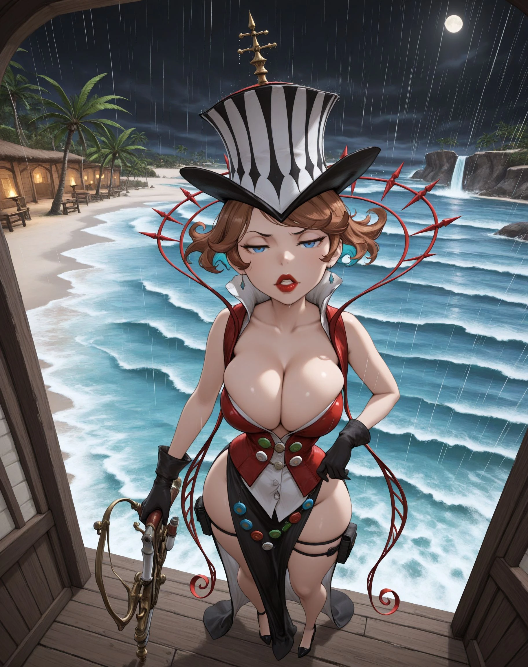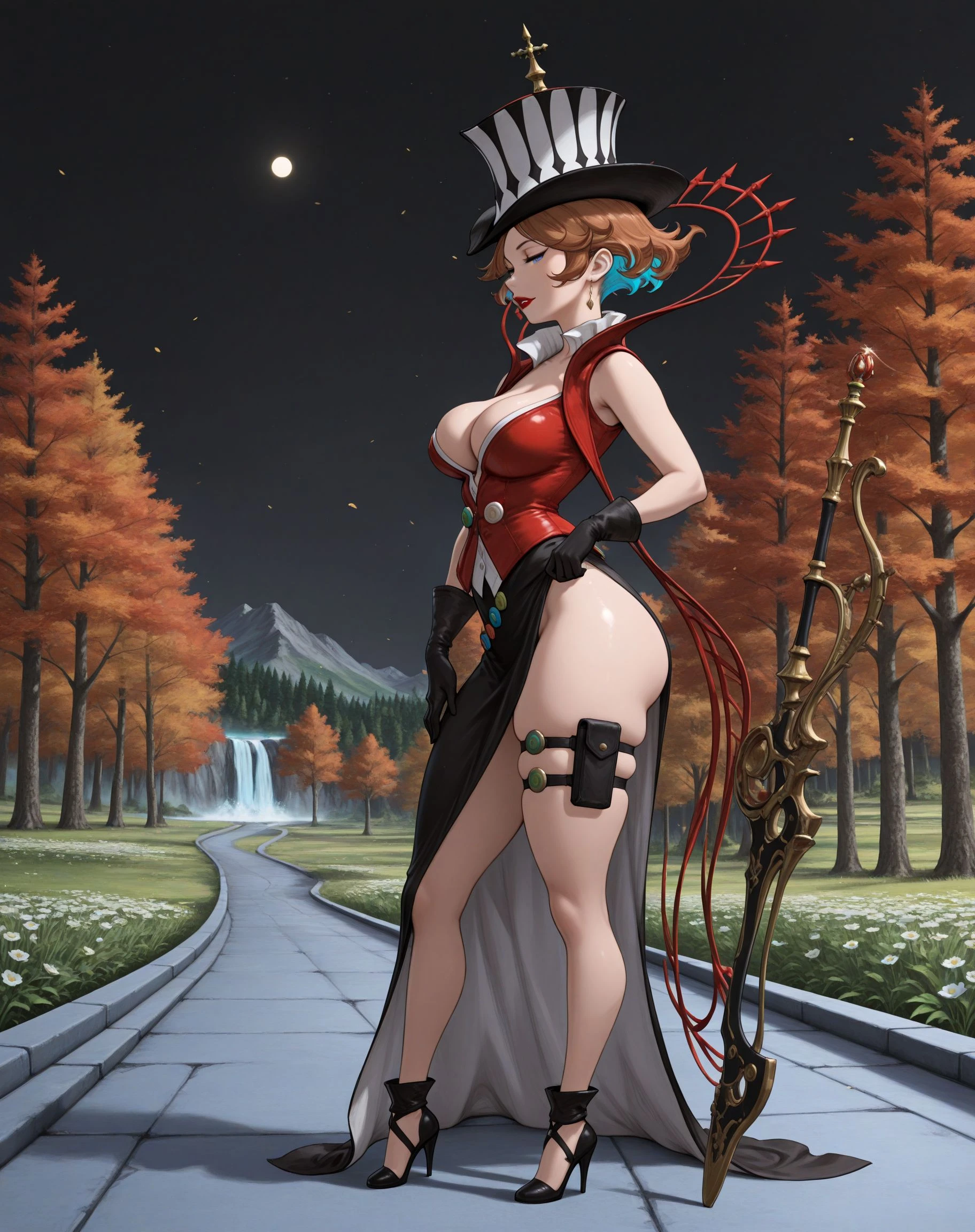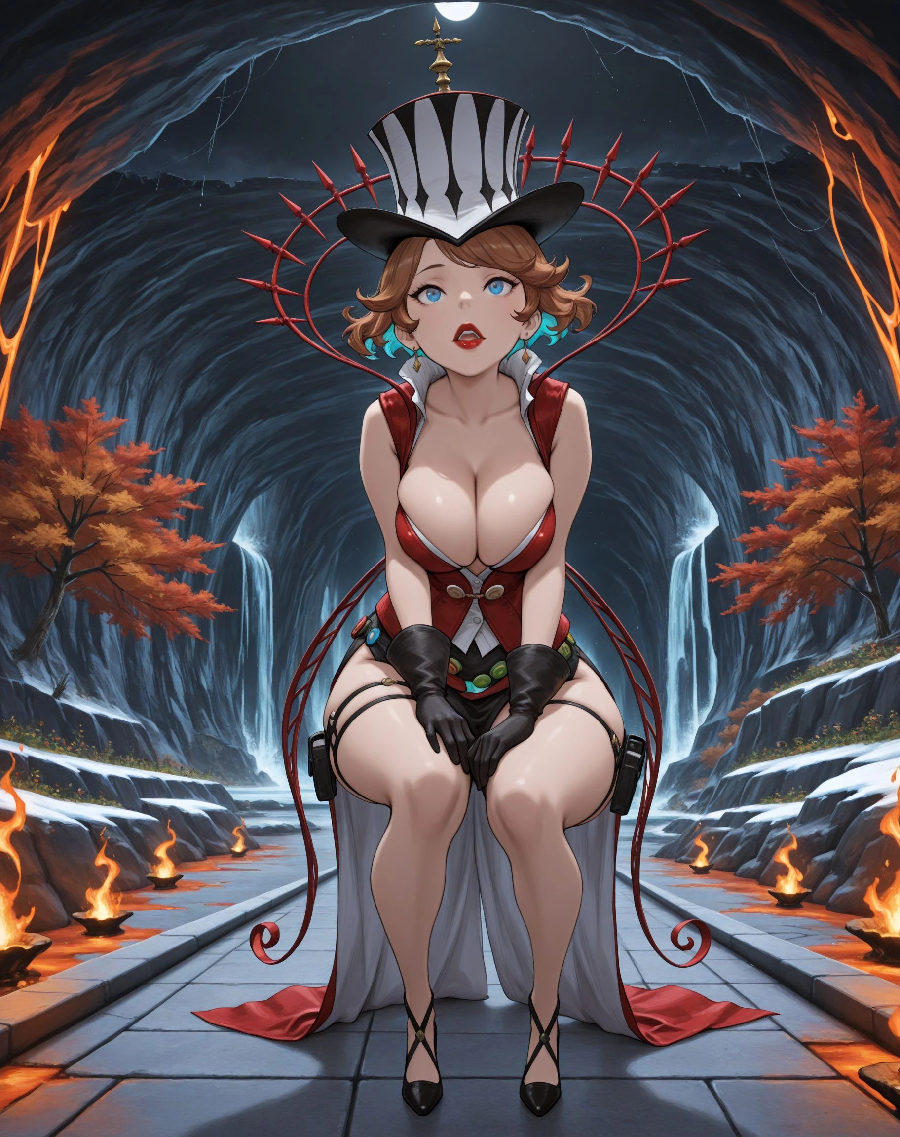 + 1girl, solo, blue eyes, brown hair, short hair, multicolored hair, top hat, makeup, lipstick, jewelry, earrings,