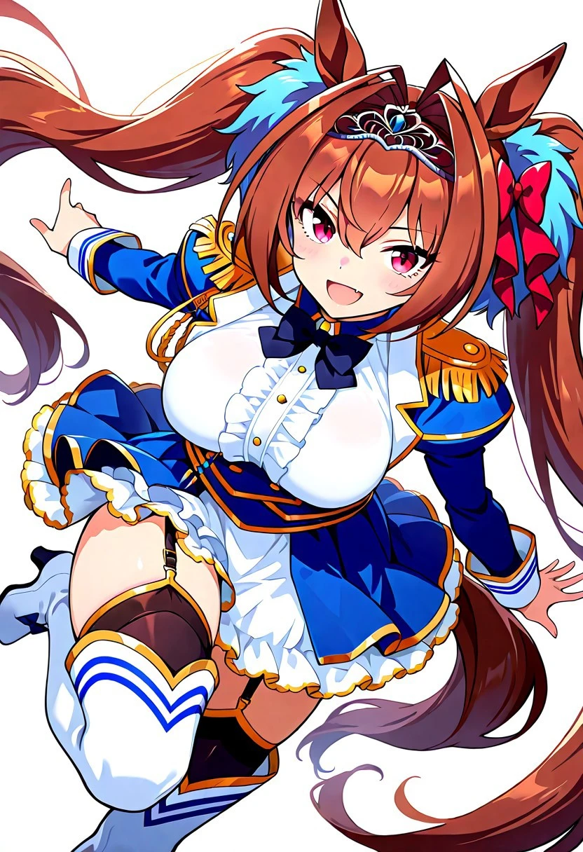 red eyes,brown hair,twintails,horse ears,horse tail,tiara,hair intakes,antenna hair,hair between eyes