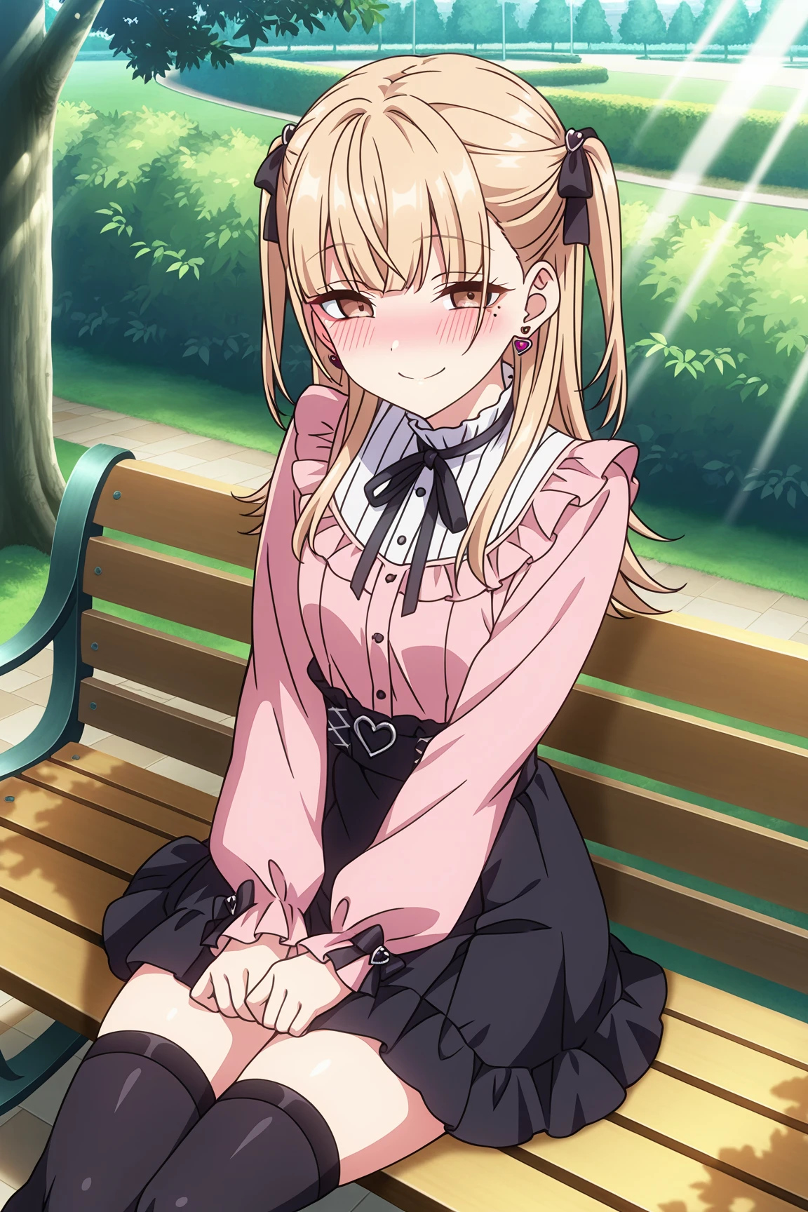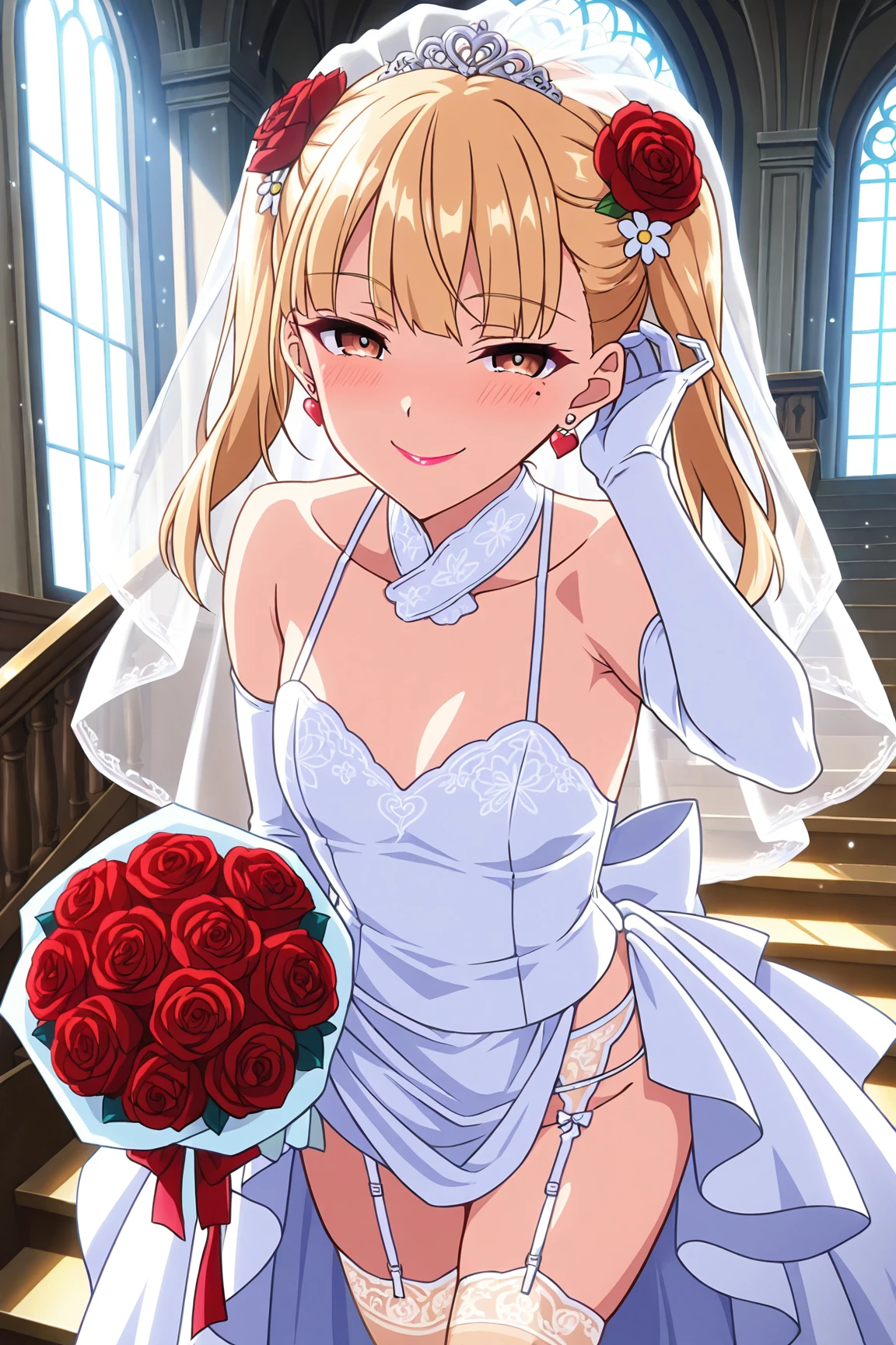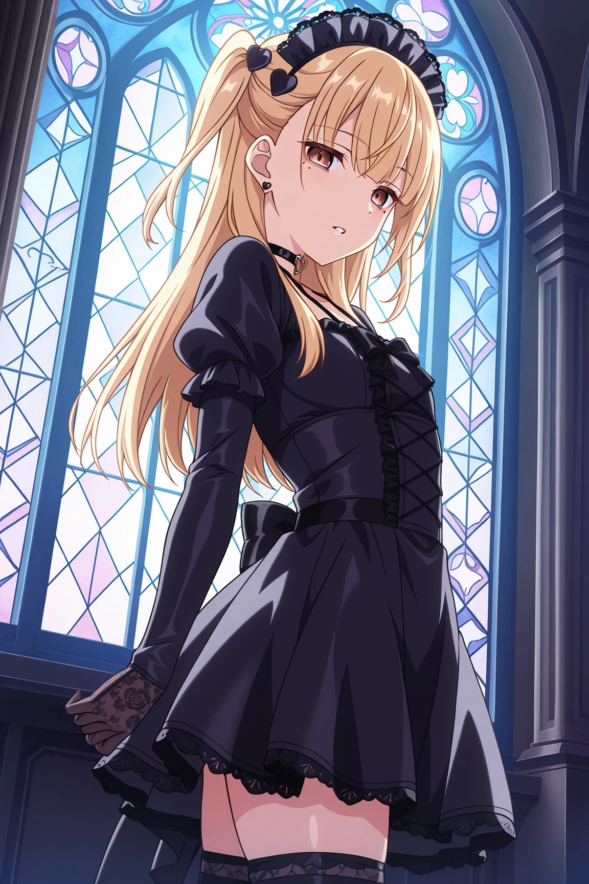 Appearance : londe hair,pigtails,heart earrings,bangs,long hair,brown eyes,flat chest,mole under right eyes