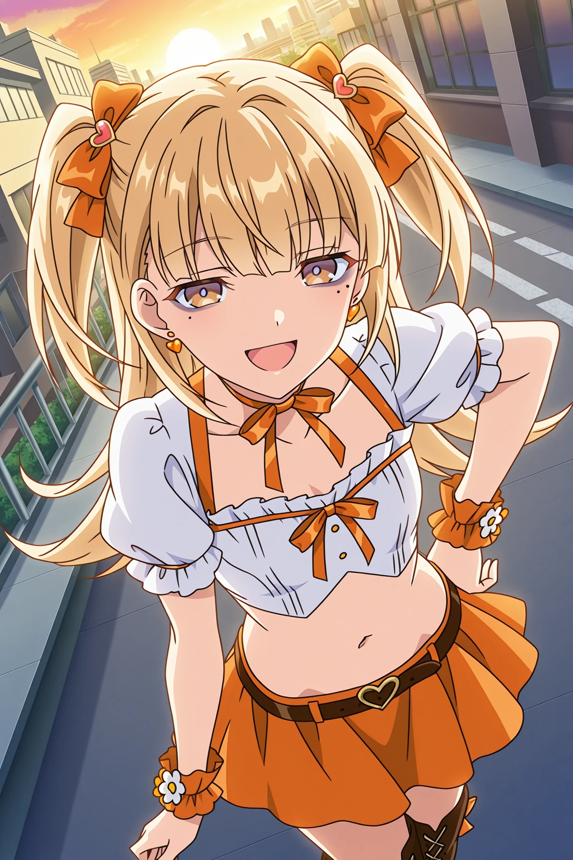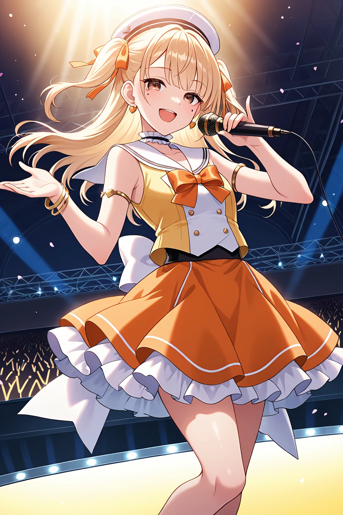 Idol outfit : sailor hat,hair ribbon,orange ribbon,orange bowtie,frilled choker,white sailor collar,yellow jacket,sleeveless jacket,side bow,waist bow,large bow,orange bow,collared shirt,bare hand,bracelets,armlet,puffy skirt,orange skirt,white puff,bare legs