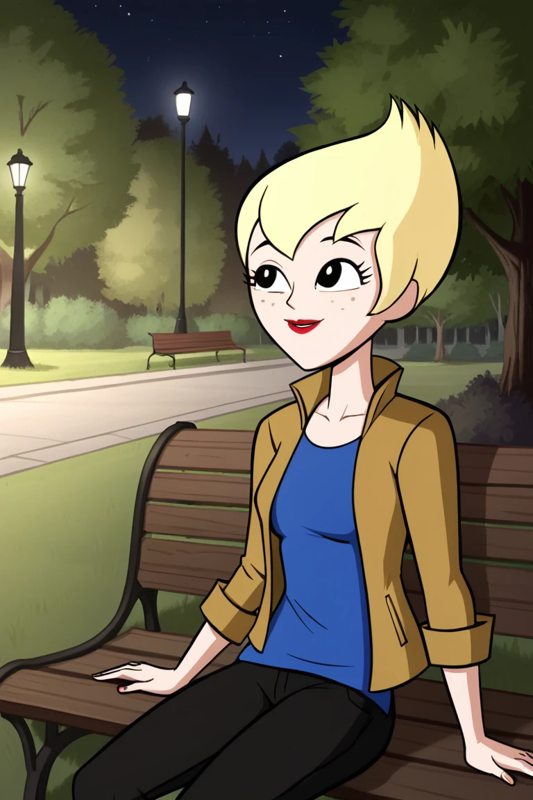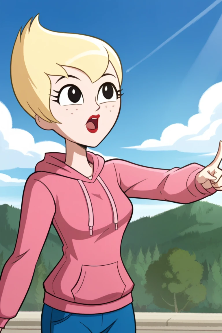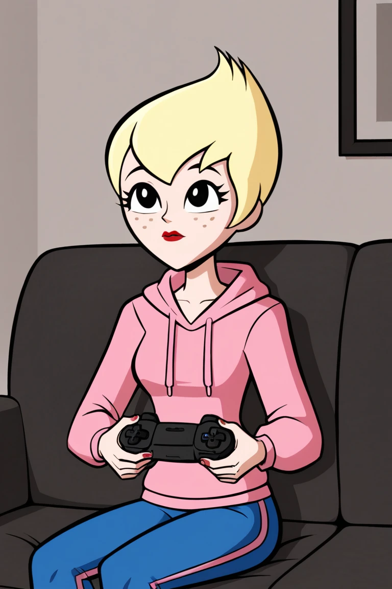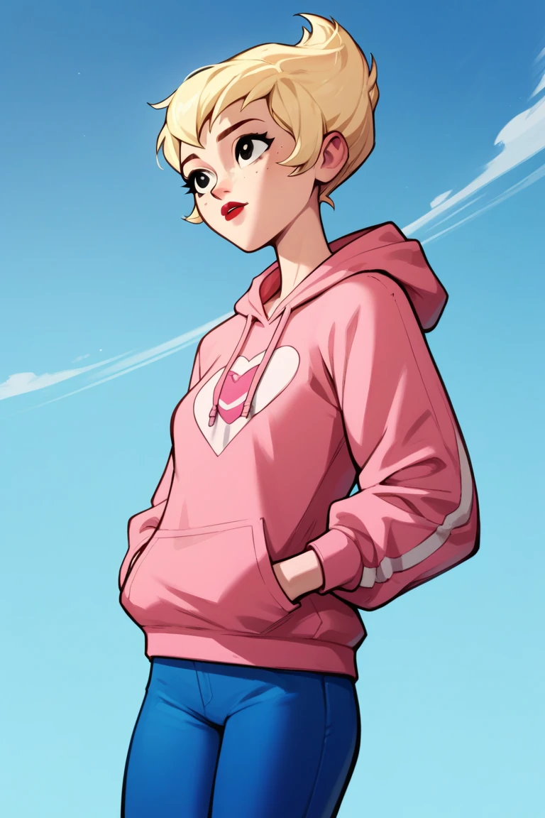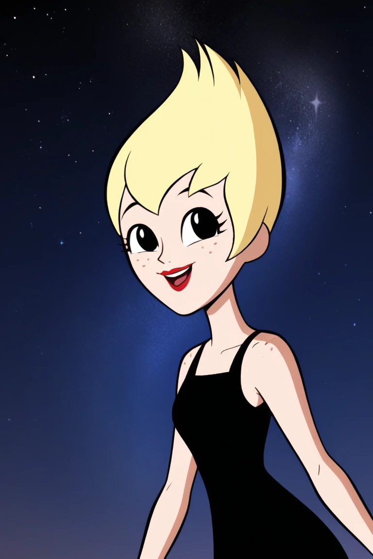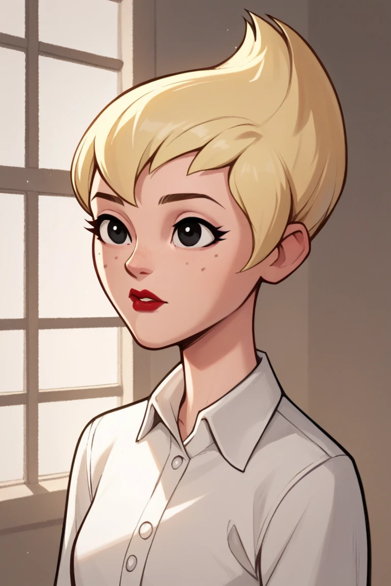 Ilana,1girl,solo,blonde hair,short hair,black eyes,freckless,red lips