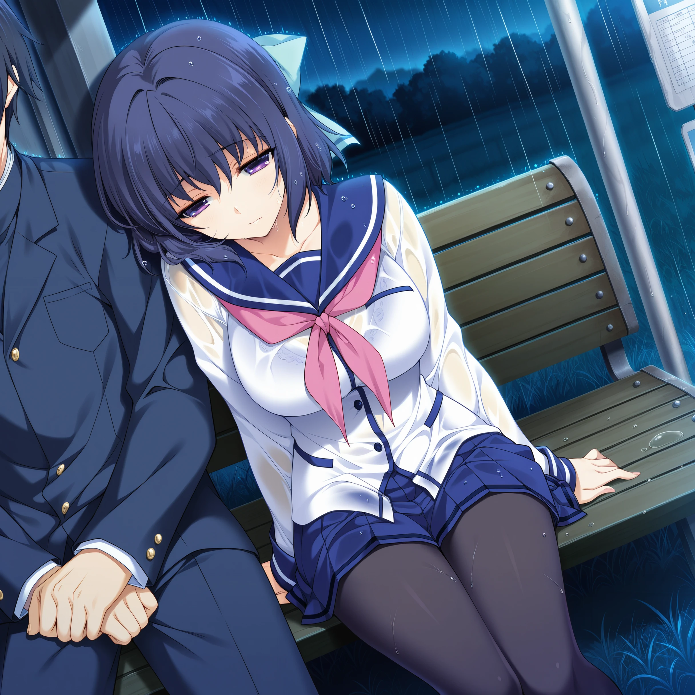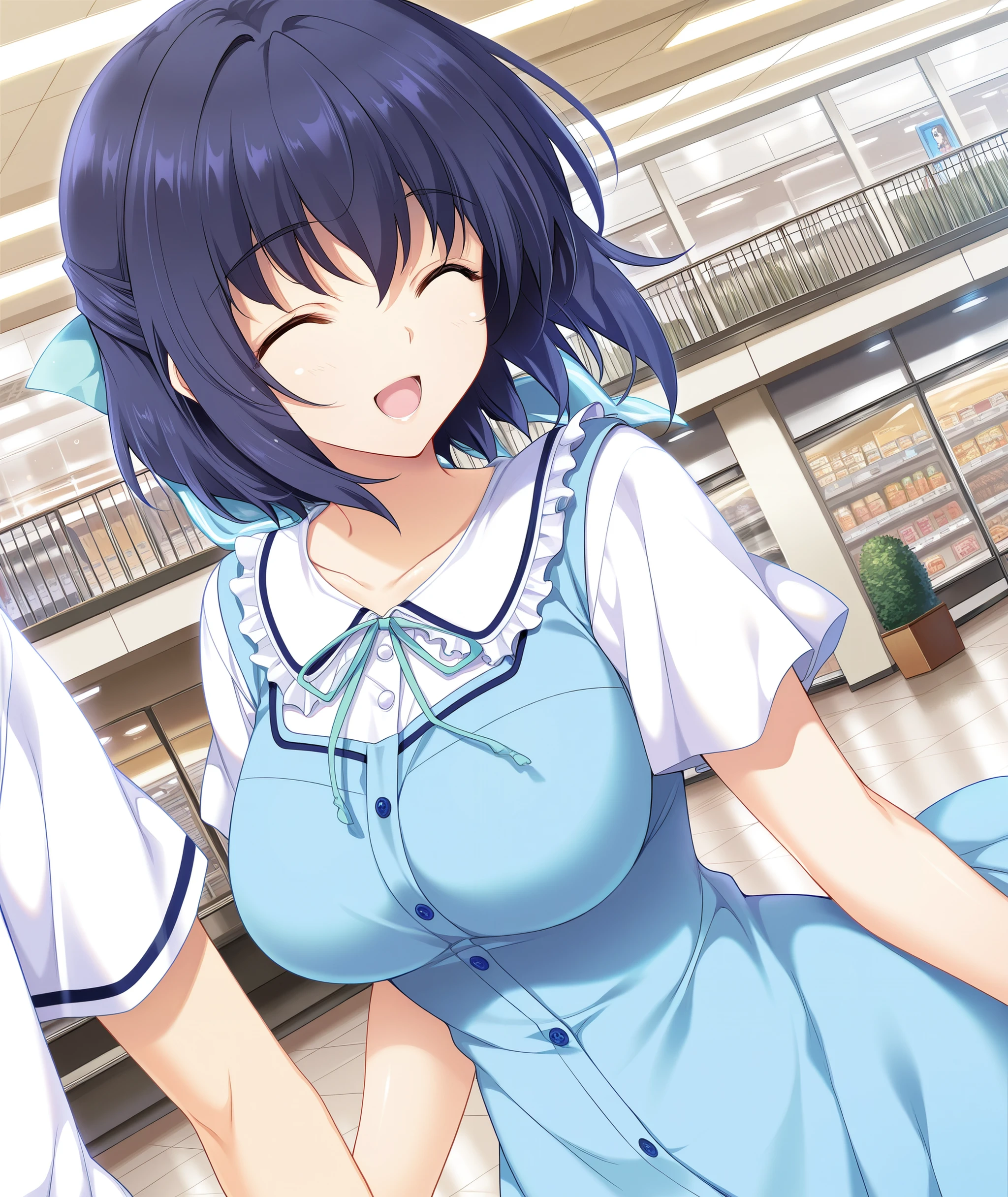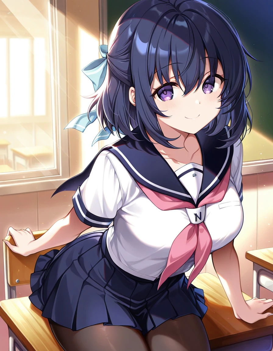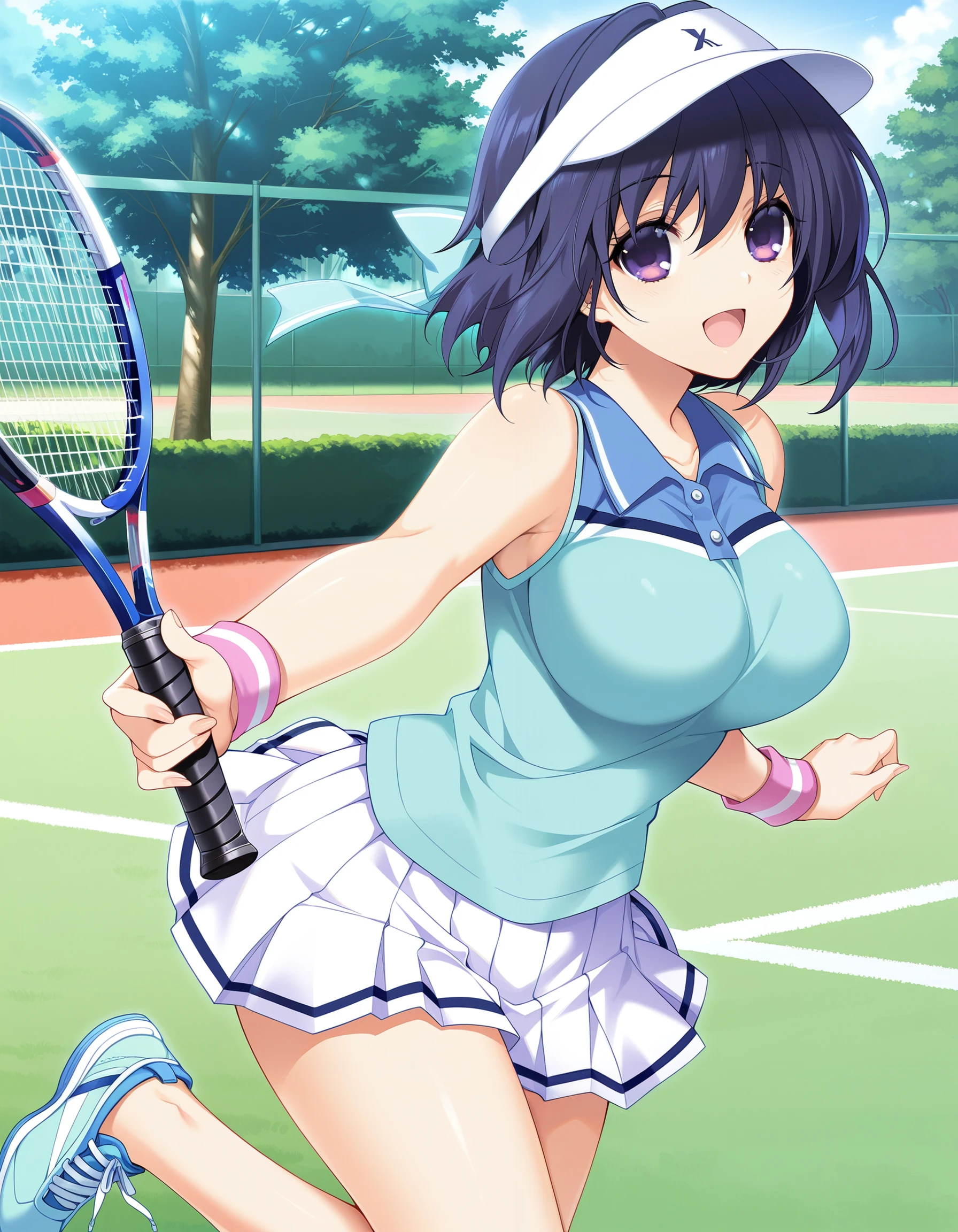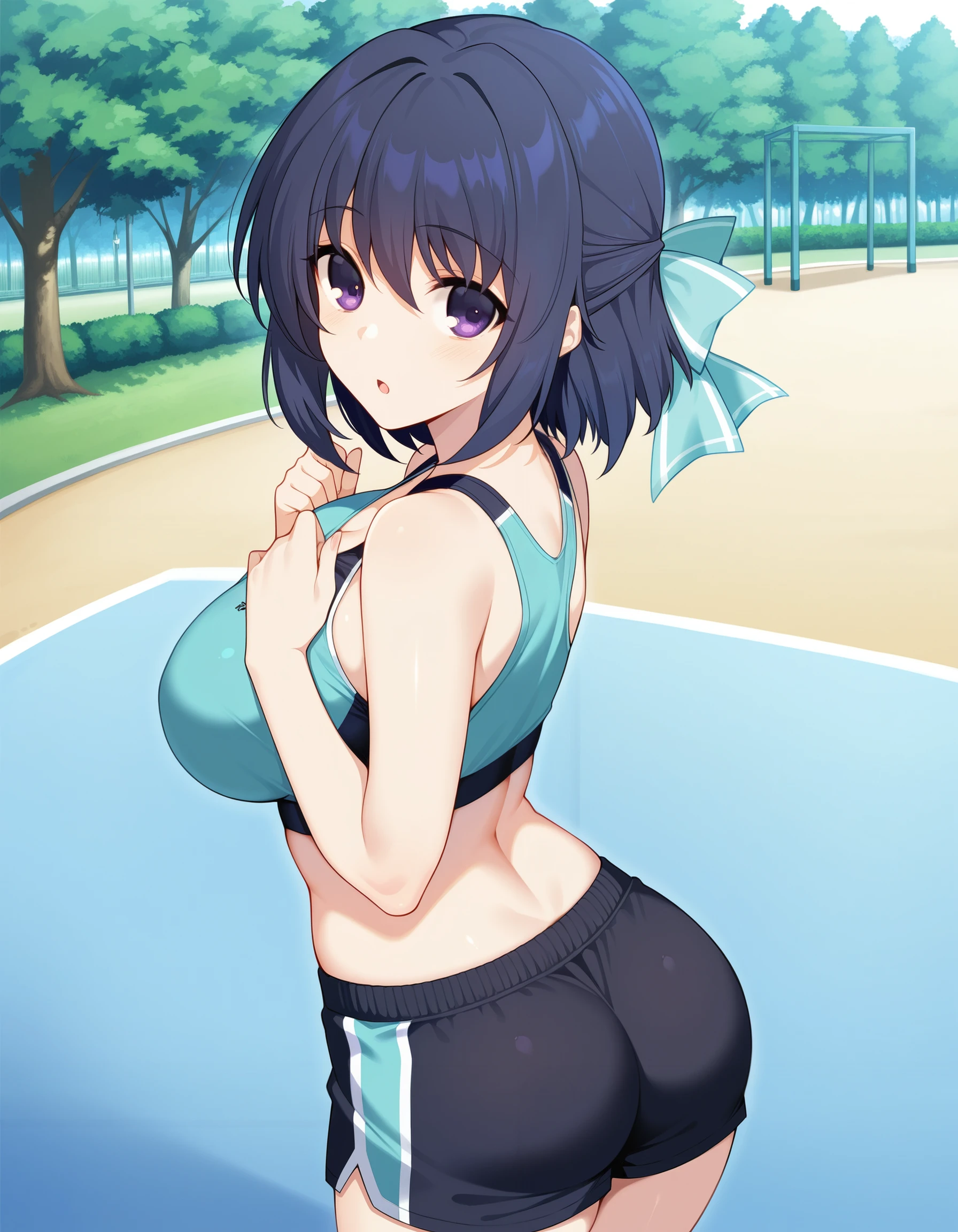 nanasawa yuni, lovely x cation, medium large breasts, purple eyes, short hair, dark blue hair, cyan hair ribbon, hair between eyes
