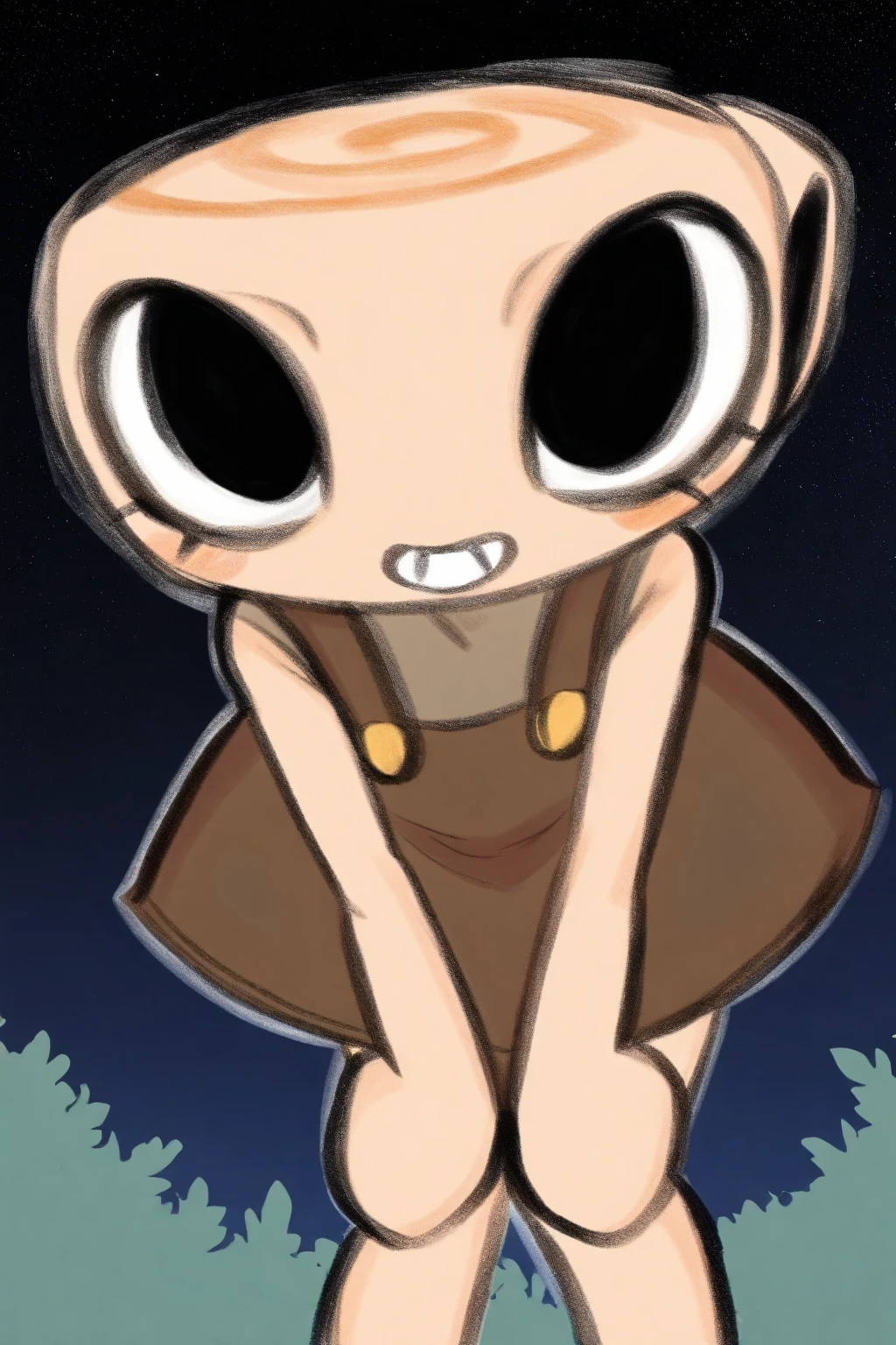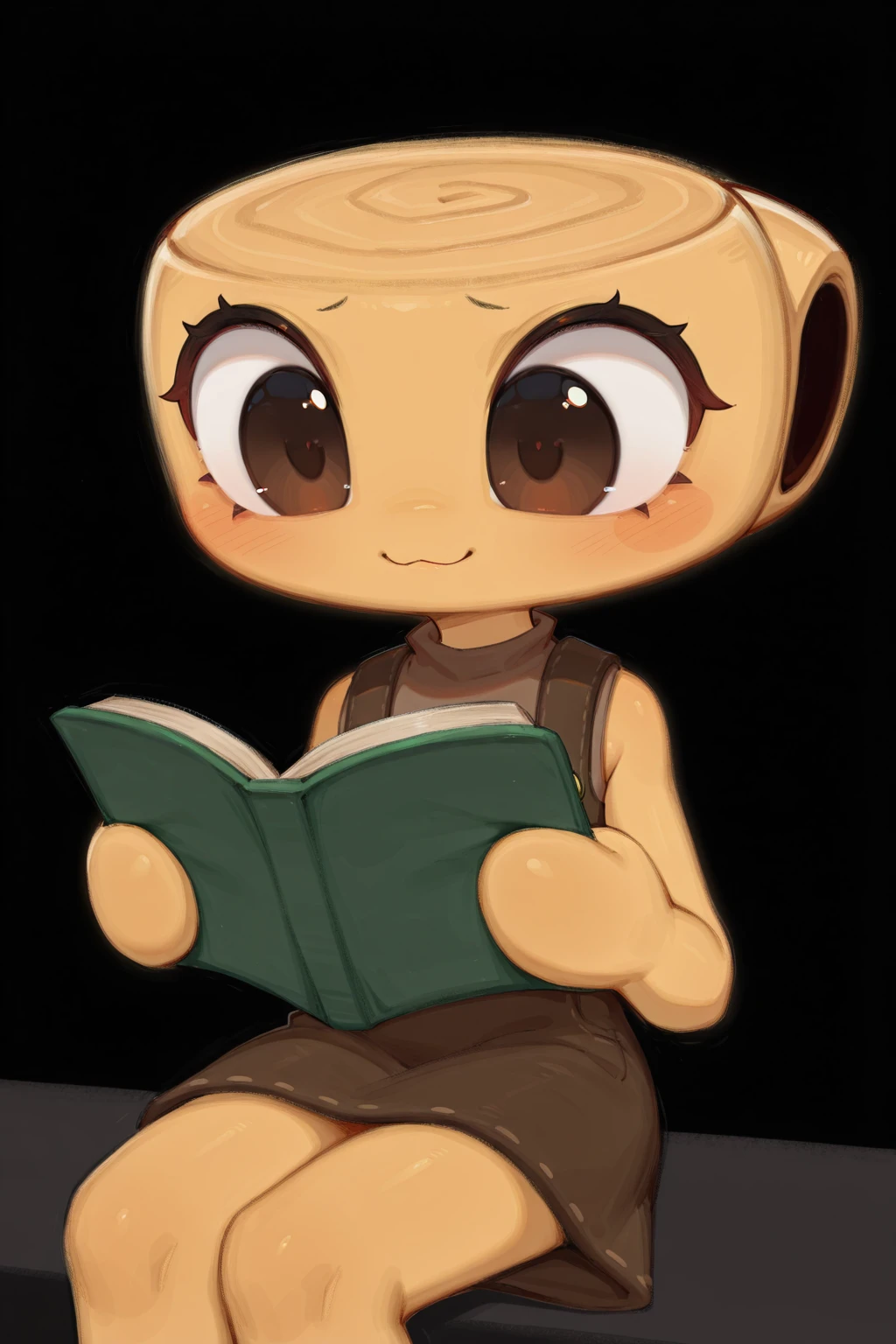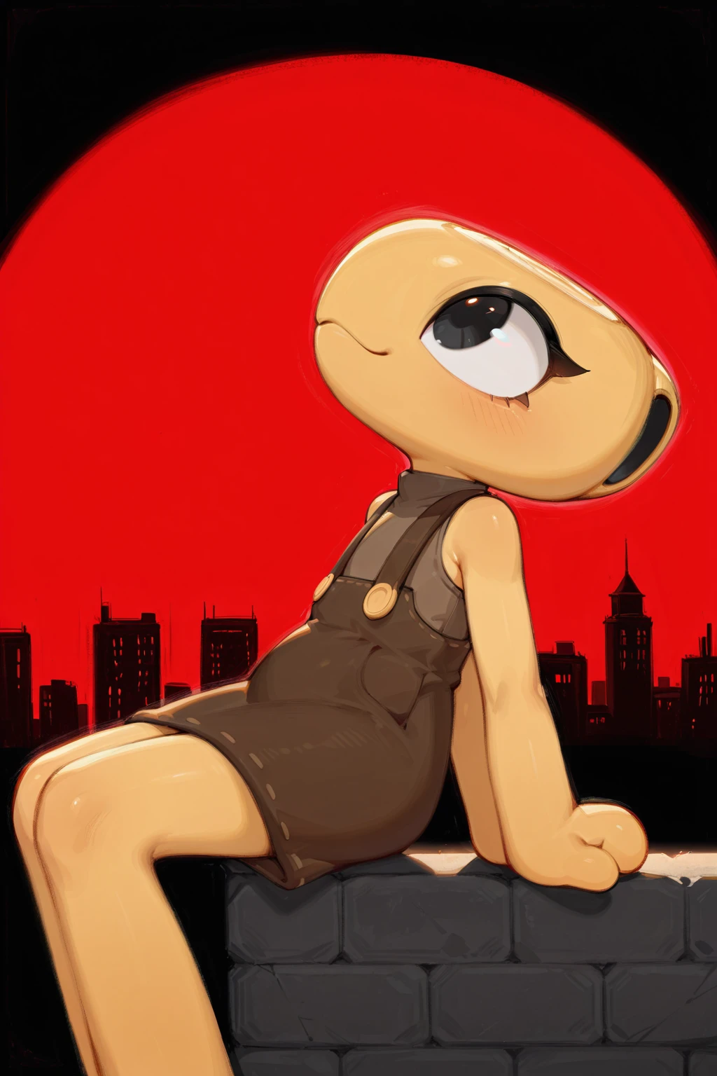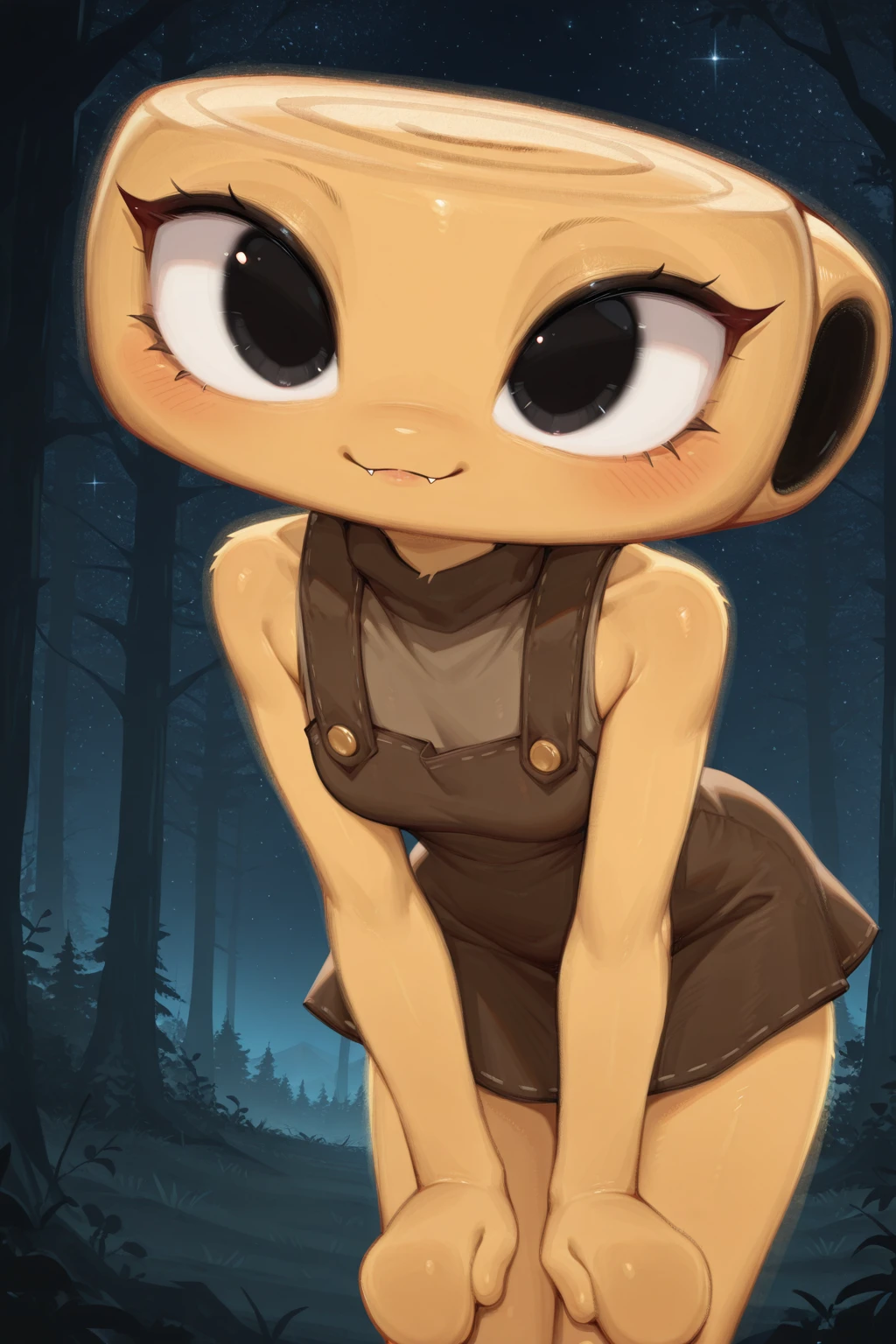 Helpful: 1girl, black eyes, anthro, object head, ammonite head, overall dress, short dress, sleeveless shirt, circle hands, no fingers