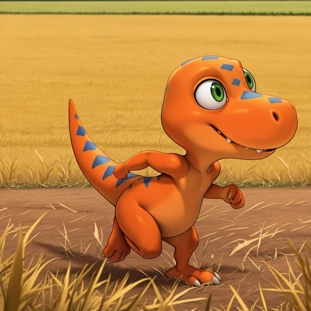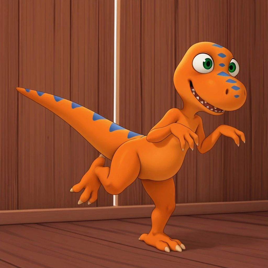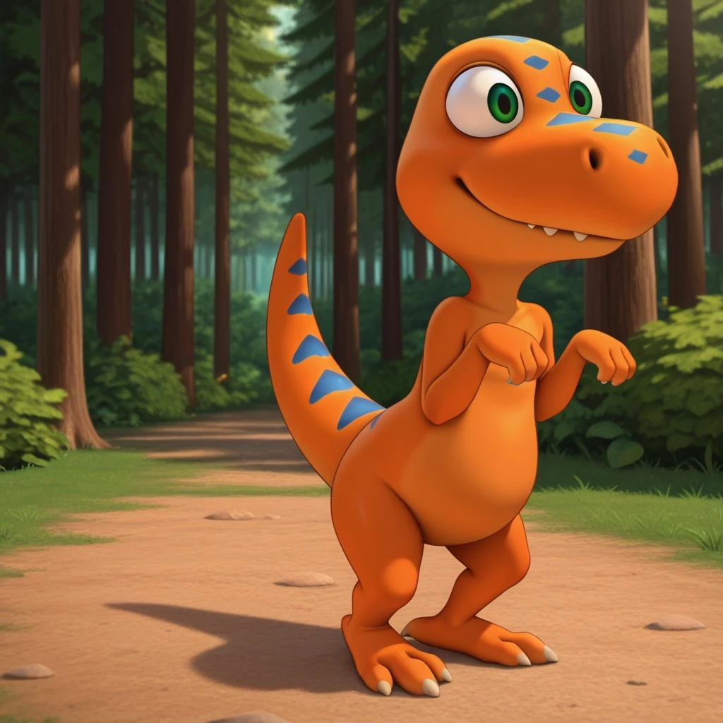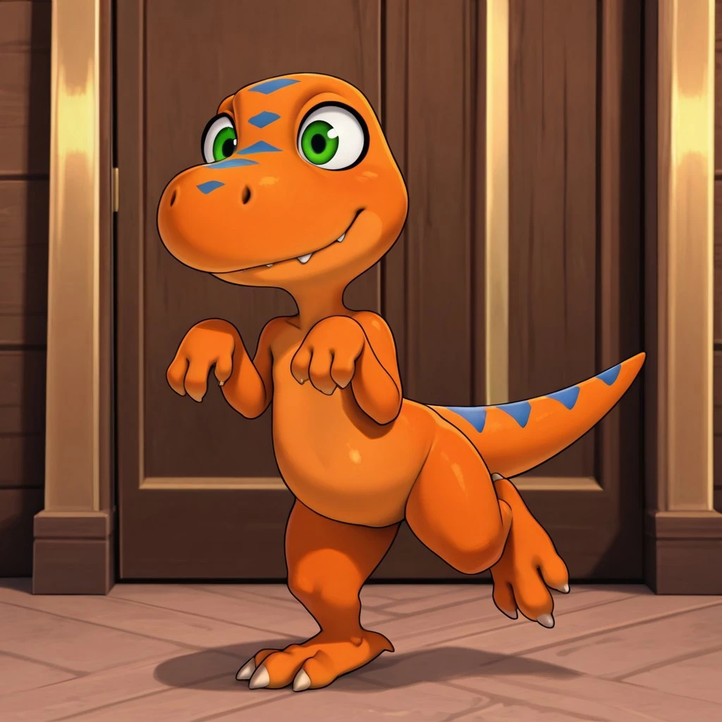 dtbuddyil, semi-anthro, male, Tyrannosaurus, orange skin, blue stripes, green eyes,
