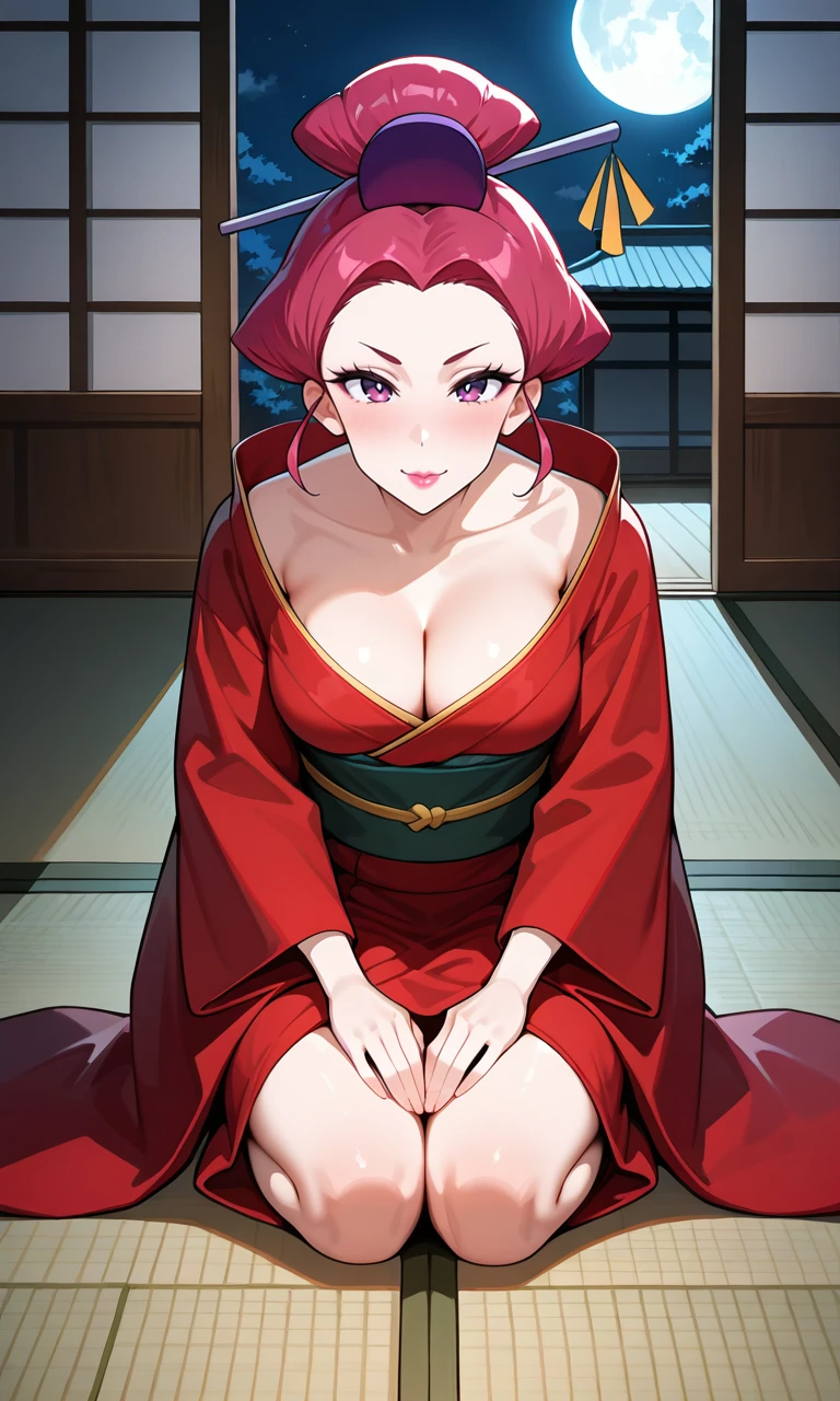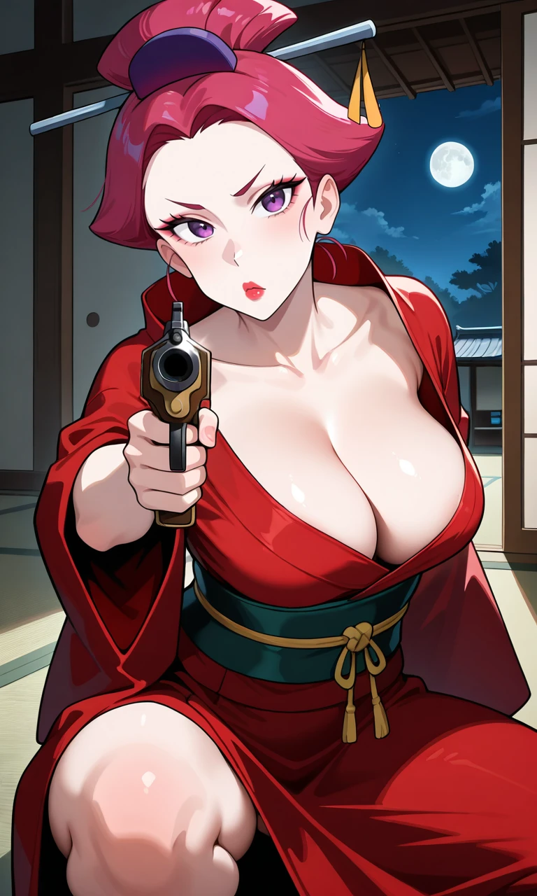 black eyas, eyelashes, magenta hair, single hair bun, forehead, hair ornament, hair stick, pale skin, led thick lips, lipstick, makeup, red kimono, wide-open collar, open neckline, wide sleeves, dark green obi, large breasts, mature female