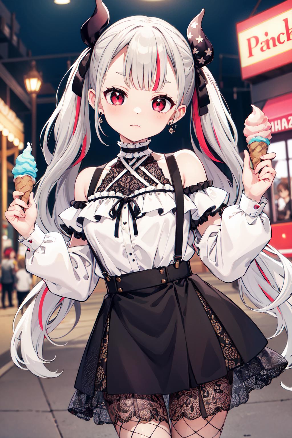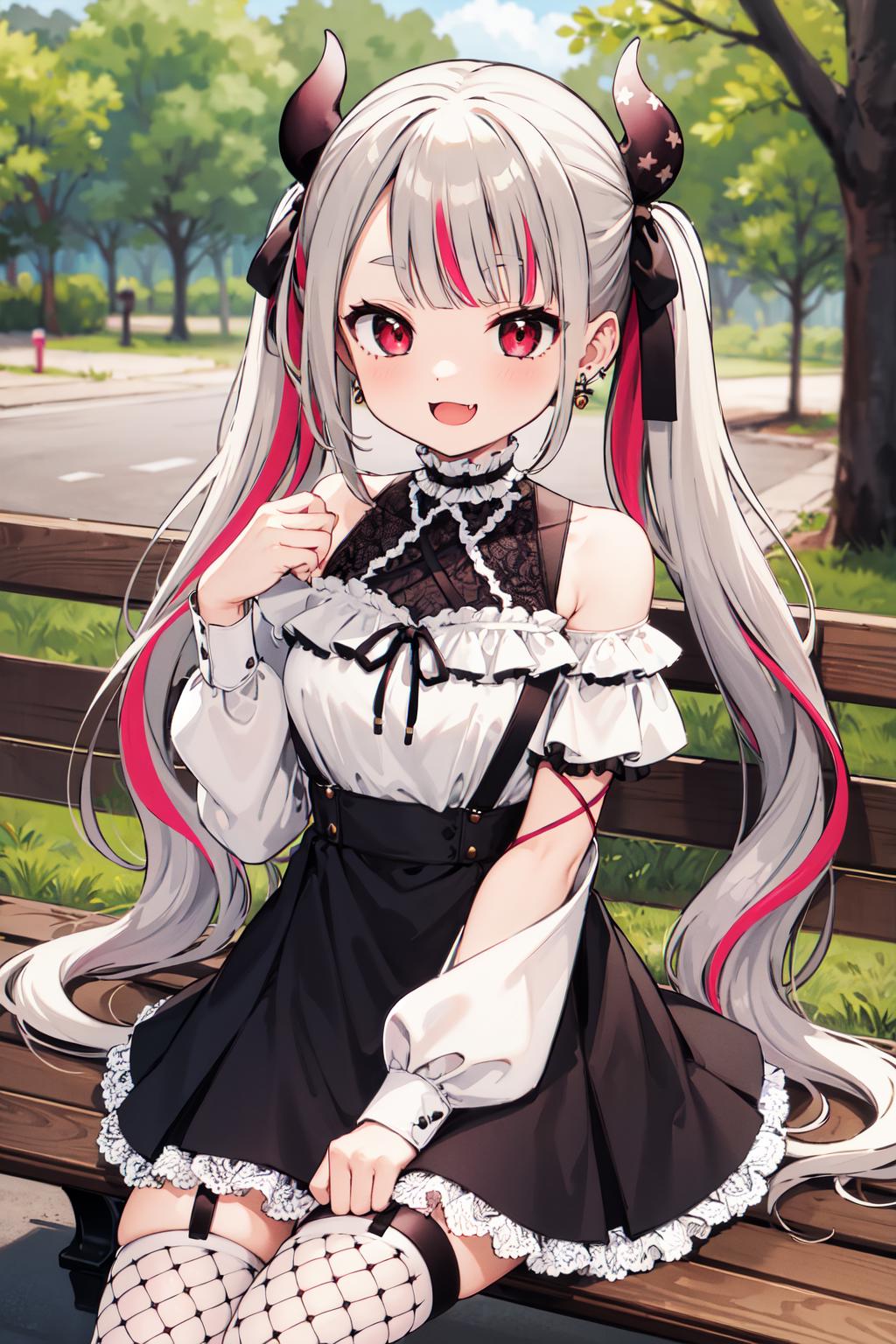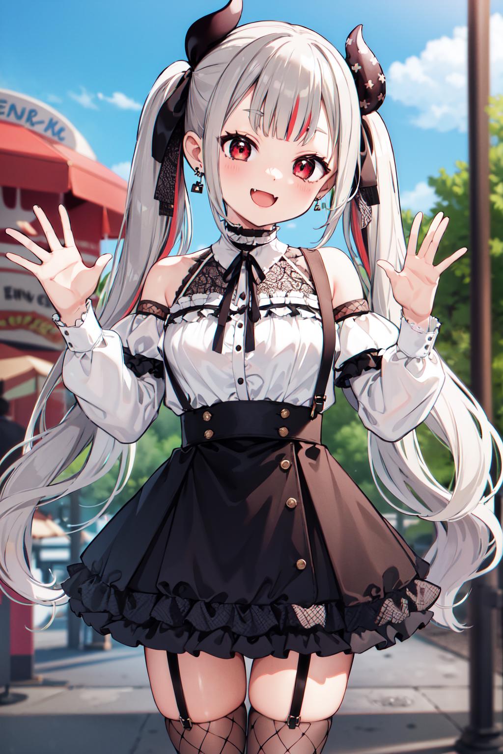 outfit2hmnab, multicolored hair, hair bow, twintails, white shirt, black skirt, fishnets, suspender skirt, bare shoulders, earrings, puffy sleeves