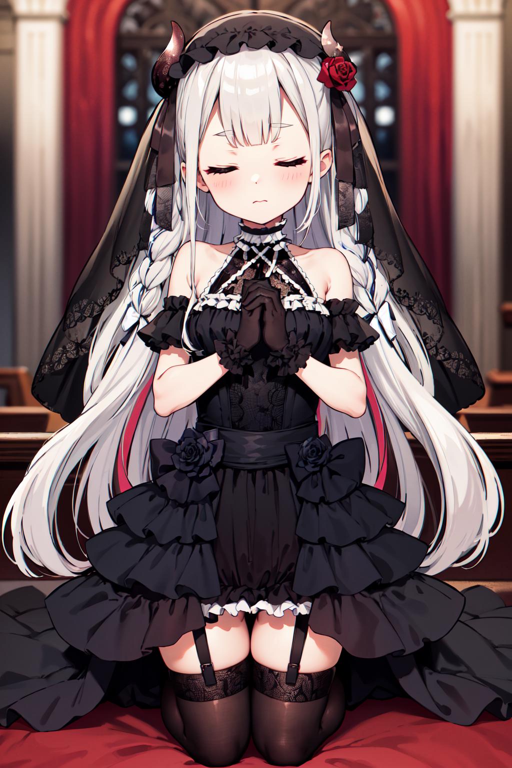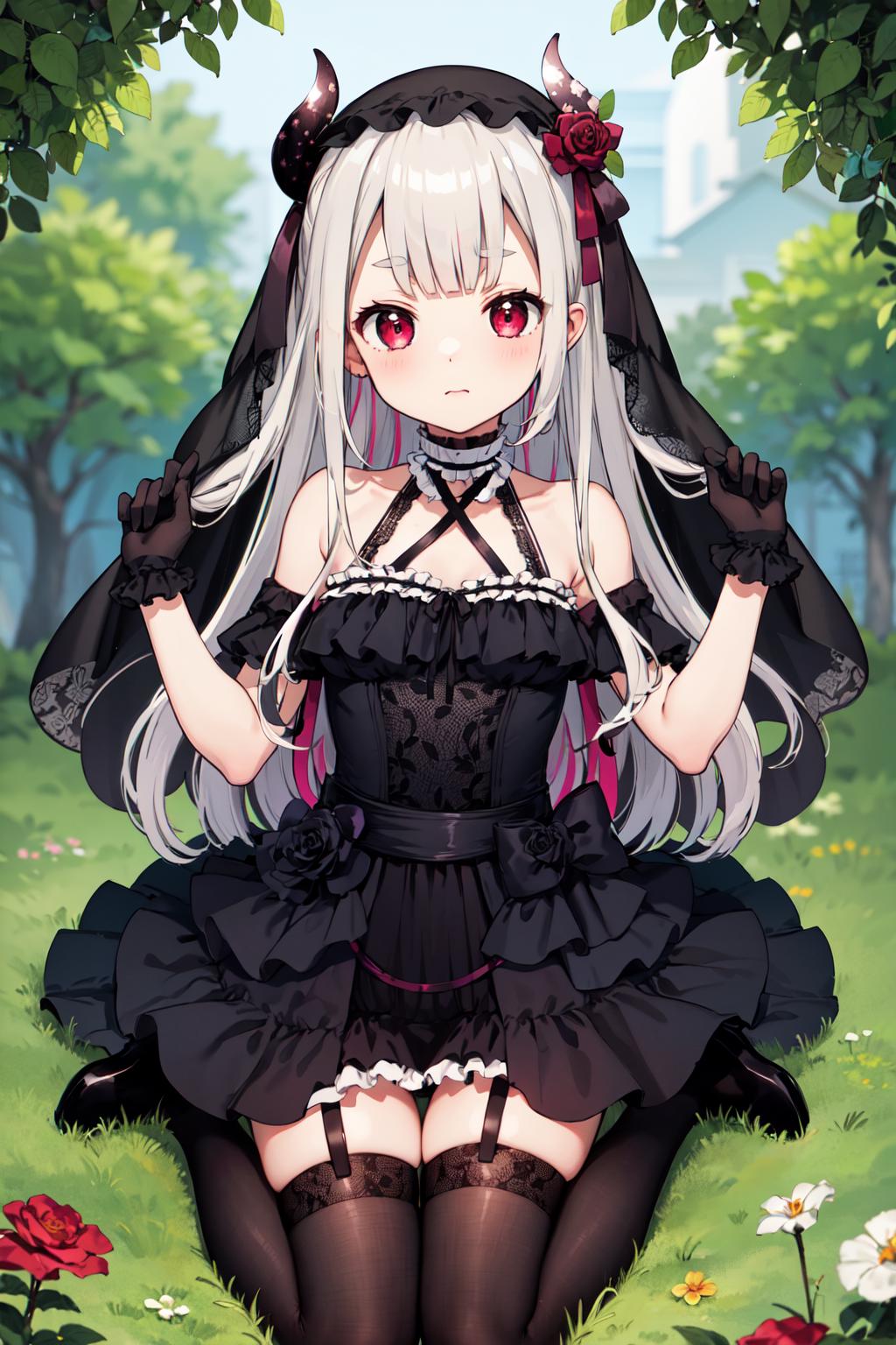 outfit4hmnad, veil, garter straps, black dress, black thighhighs, black gloves, hair bow, lolita fashion, criss-cross halter, bare shoulders, frills, rose, ribbon, multicolored hair