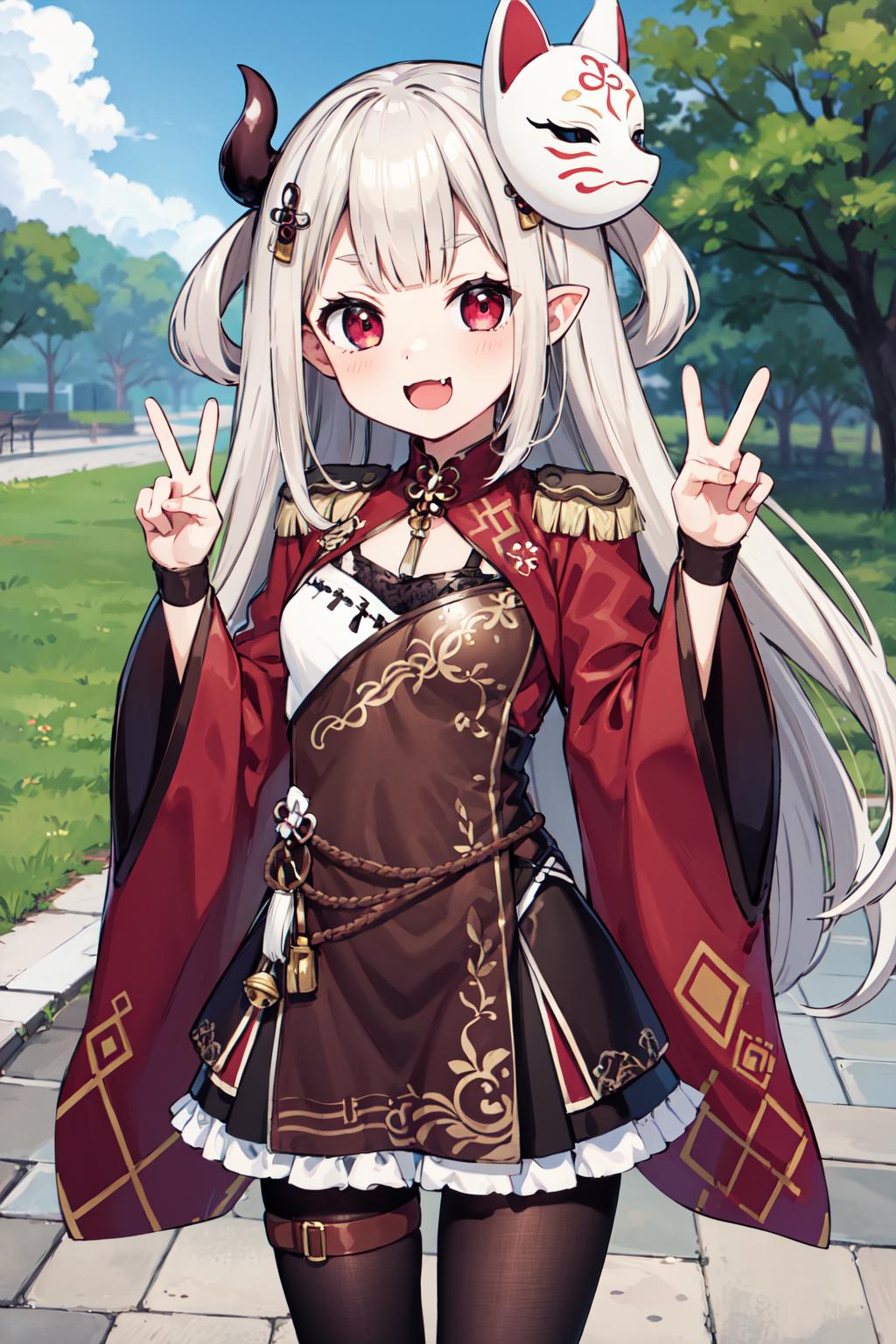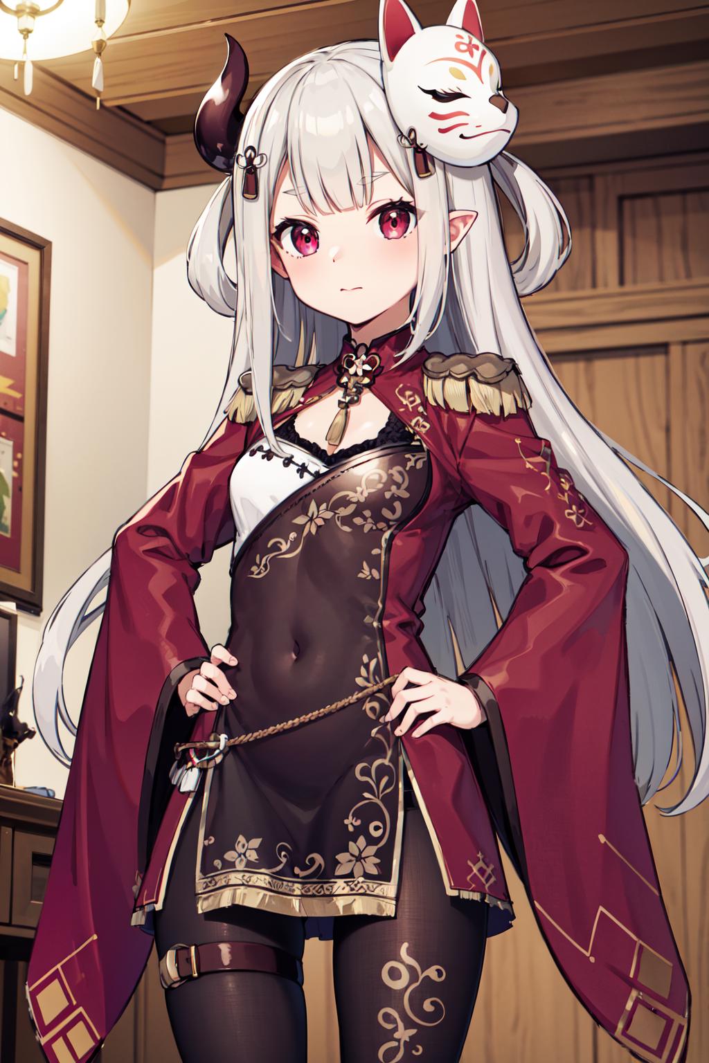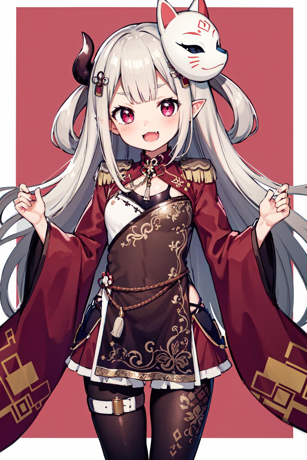 outfit1hmnaa, hair ornament, mask on head, long sleeves, wide sleeves, epaulettes, black pantyhose, thigh strap, bell