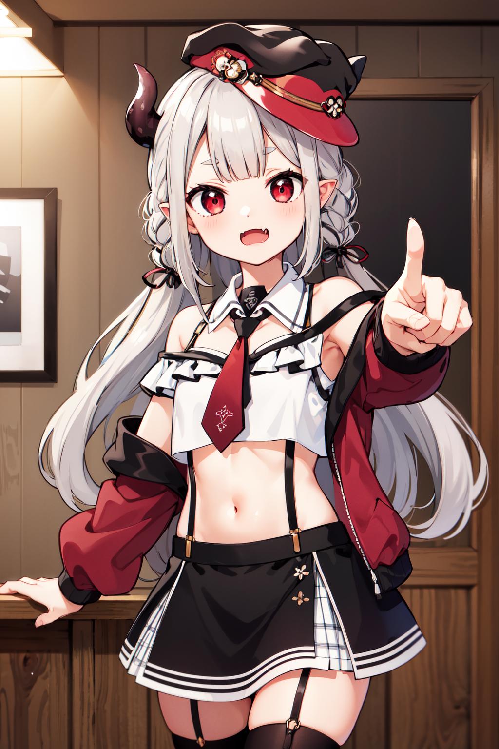 outfit3hmnac, horn, hat, midriff, white shirt, crop top, off shoulder, black necktie, long sleeves, sleeveless, black skirt, black thighhighs, thigh strap, red jacket, suspenders