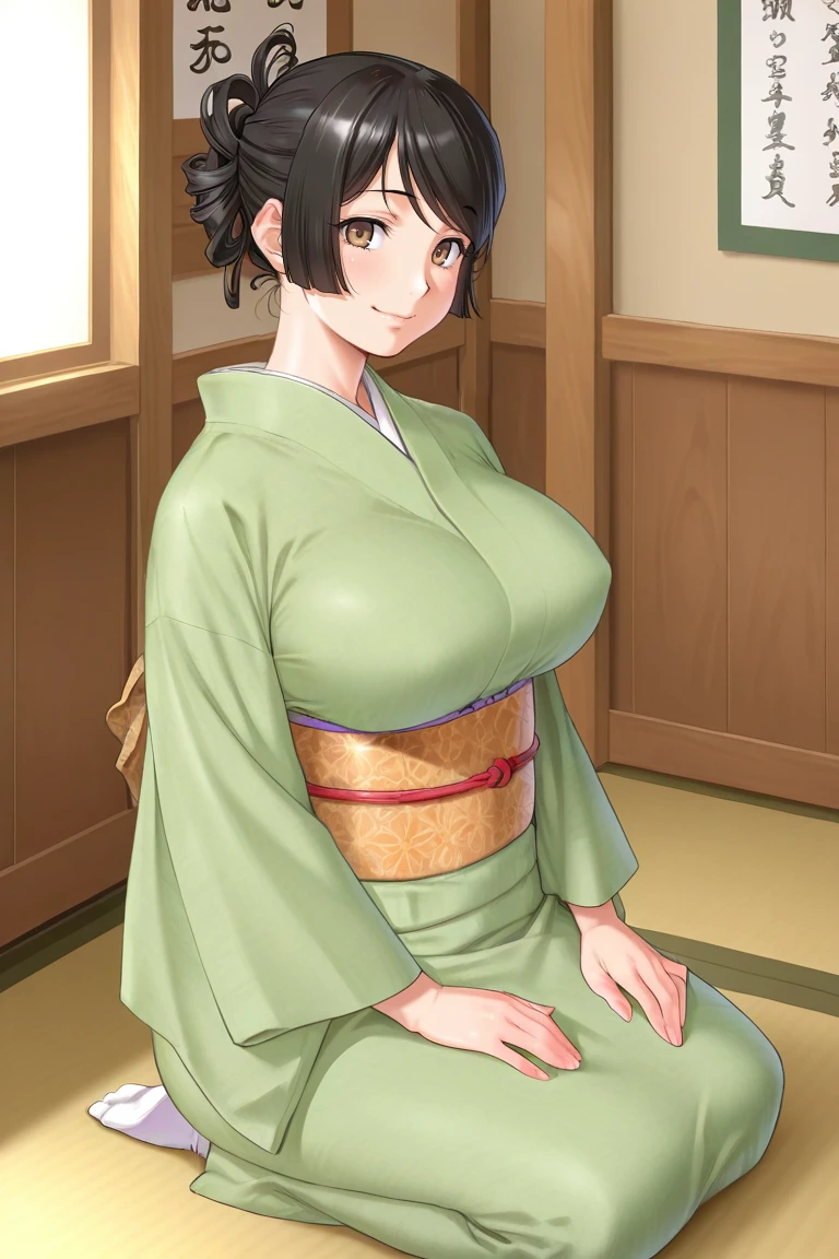 toshiko-madonna, black hair, swept bangs, updo, brown eyes, large breasts,