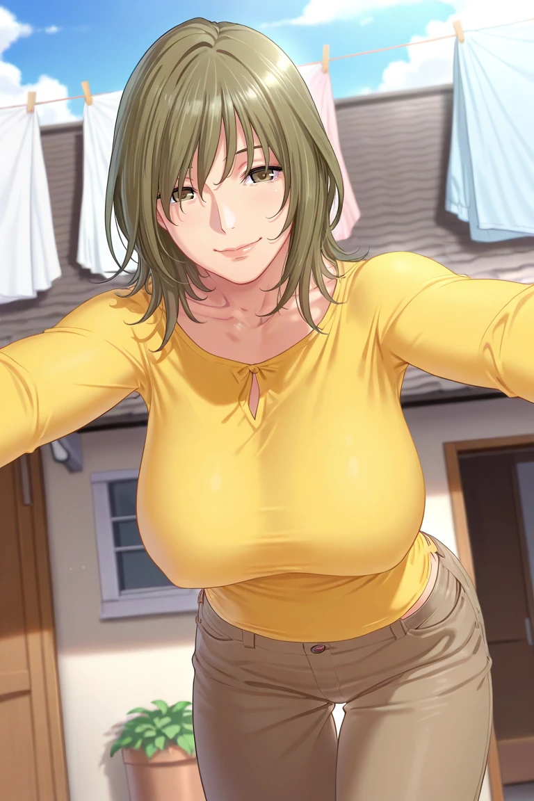 yae-casual, yellow shirt, long sleeves, brown pants,