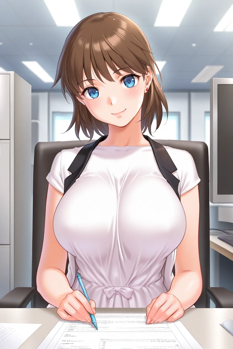 rie-madonna, brown hair, medium hair, bangs, blue eyes, earring, large breasts,