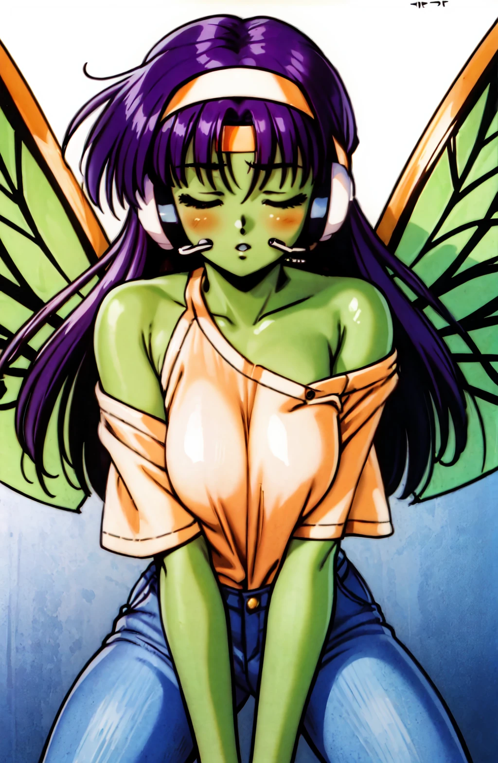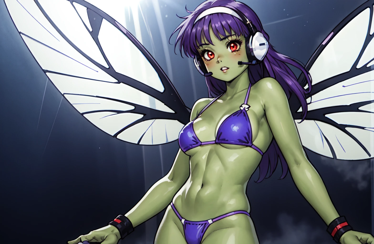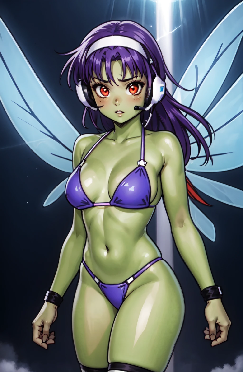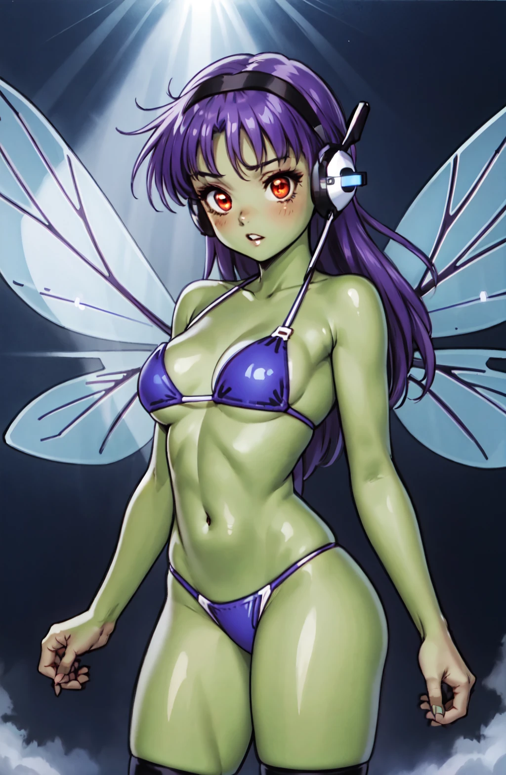 Prompt: crolisproject, 1girl, red eyes, green skin, parted lips, neutral face, long hair, purple hair, fringe, glass dragonfly wings, headband, headset, purple bikini, kneehighs,