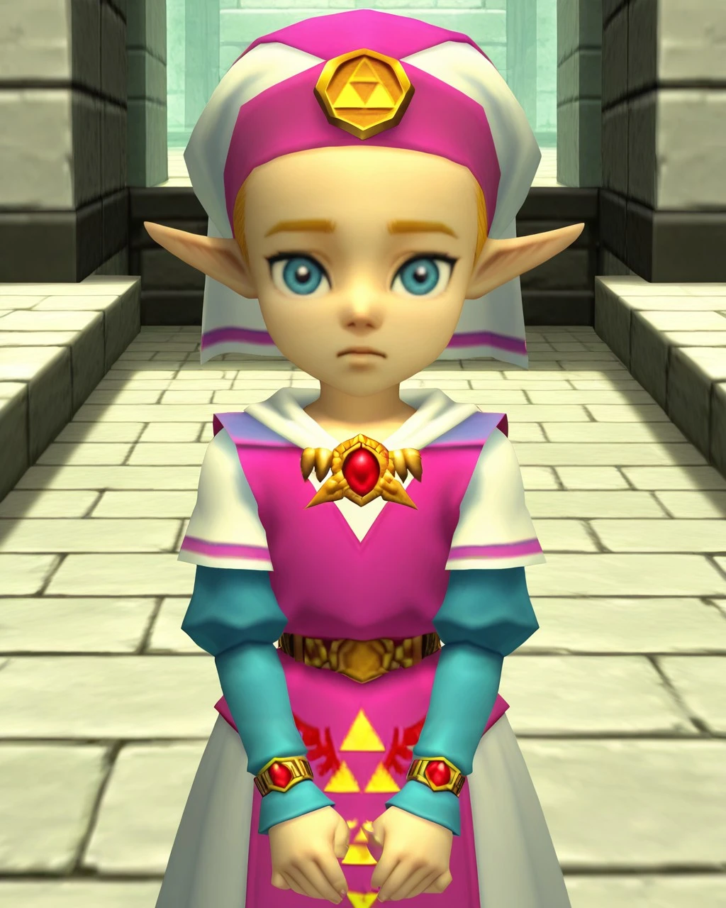 Prompt:,gamecharacter,1girl,solo,pointy ears,blonde hair,blue eyes,hat,dress,triforce,aged down,belt,1girl,anime screencap