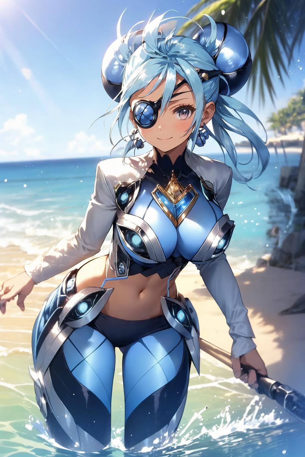 Add "eyepatch, earrings, hair ornament, blue bodysuit, midriff" for her typical look.