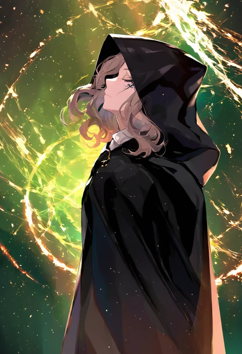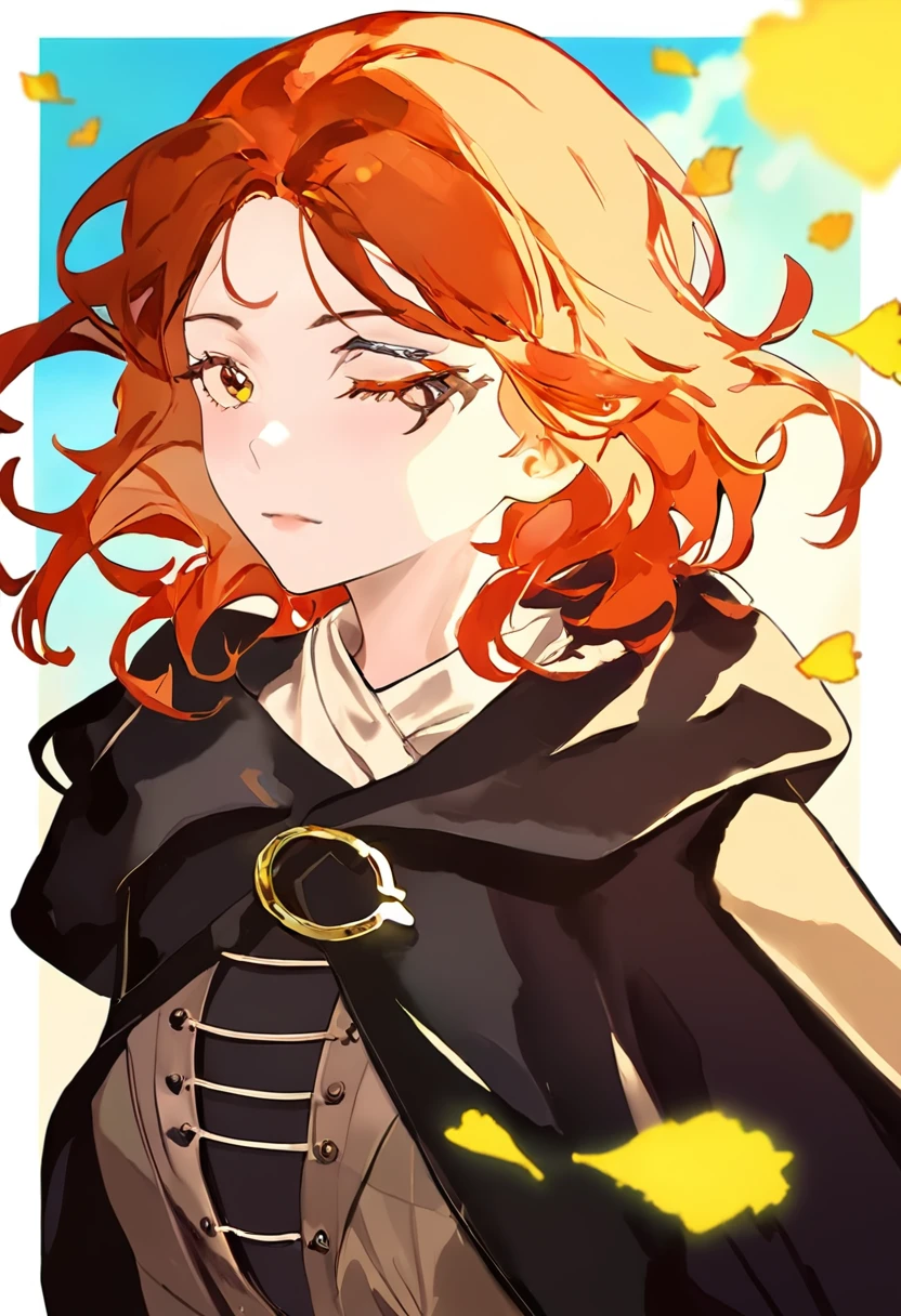 Trigger word:1girl,short brown hair,yellow eyes,black facial tattoo,one eye closed,golden cloak clasp,brown elbow gloves,hooded cape,hood up,grey dress with corset,brown knee-high boots