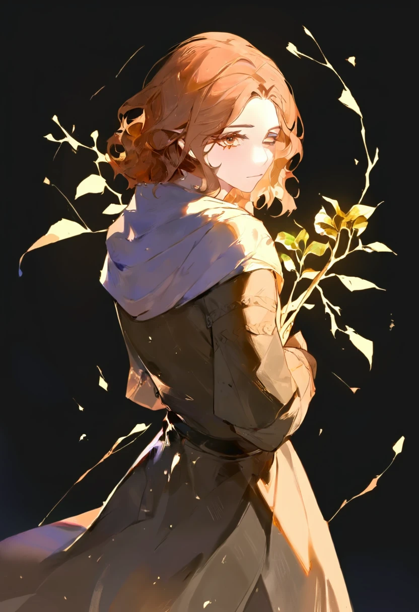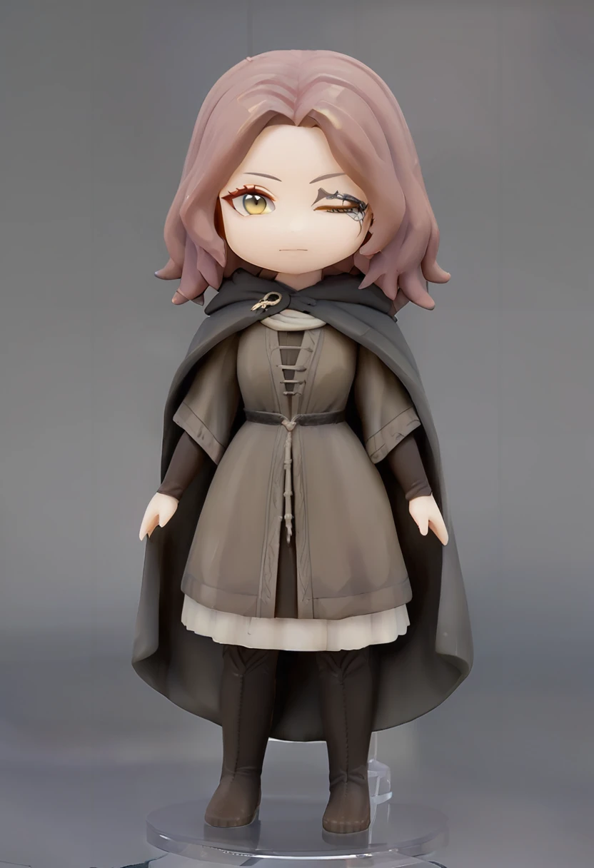 触发词:1girl,short brown hair,yellow eyes,black facial tattoo,one eye closed,golden cloak clasp,brown elbow gloves,hooded cape,hood up,grey dress with corset,brown knee-high boots