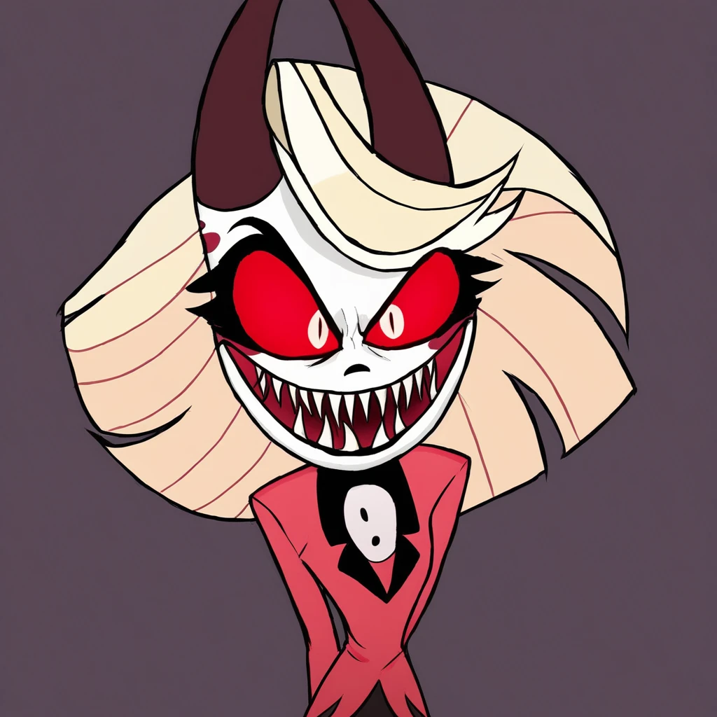 Charlie Magne, blonde Hair, pale Skin, white skin, red sclera, black eyelashes, black lipstick, black toenails, Demon face, Demon eyes, demon horns, sharp teeth, slit pupils