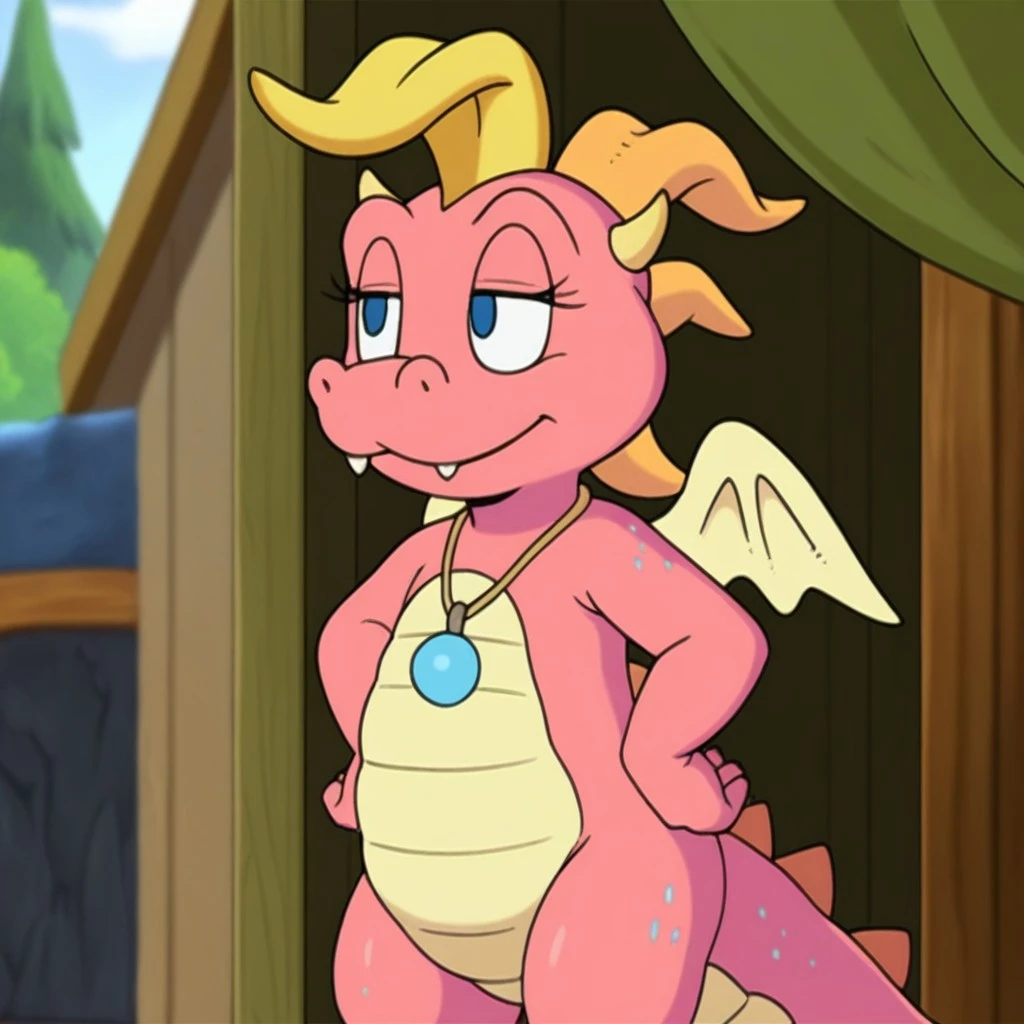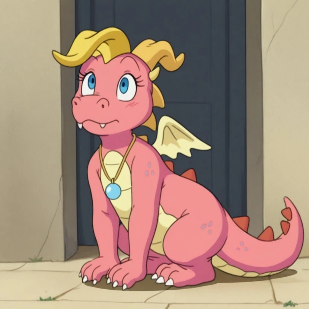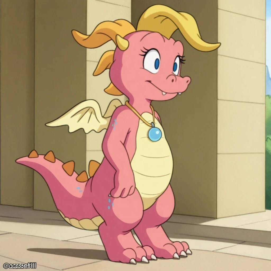 CassieDTil, semi-anthro, female, dragon, pink skin, blue eyes, horns, wings, jewelry, necklace