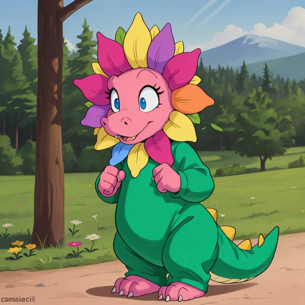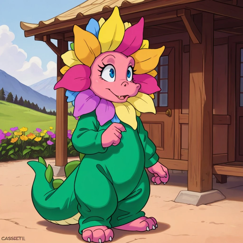 CassieDTil, semi-anthro, female, dragon, pink skin, blue eyes, flower costume, green onesie, flower onesie