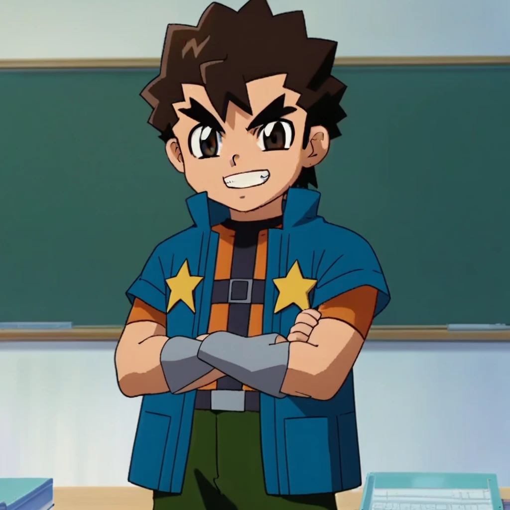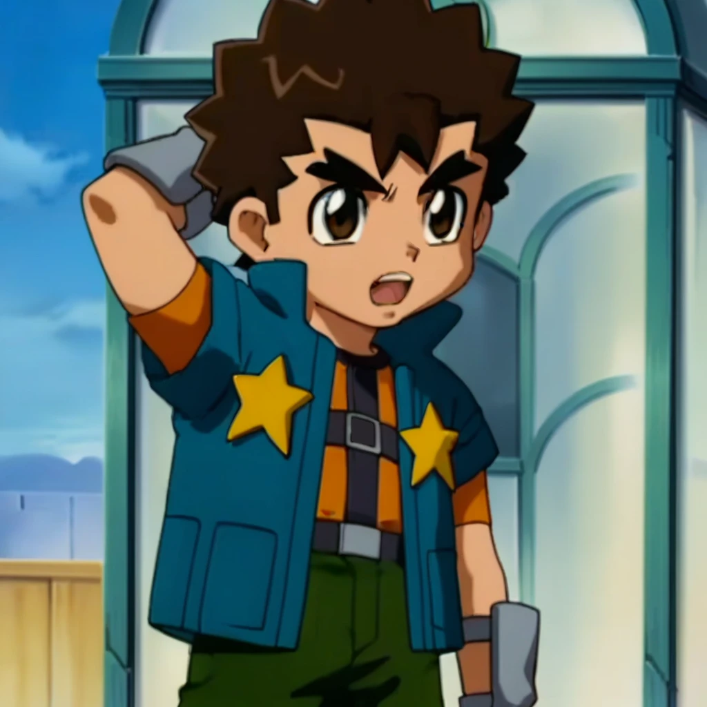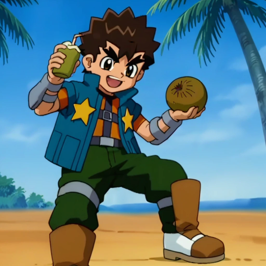 Civilian: male, brown hair, spiked hair, brown eyes, thick eyebrows, jacket, short sleeves, orange t-shirt, open clothes, bracers, belt, green pants, boots