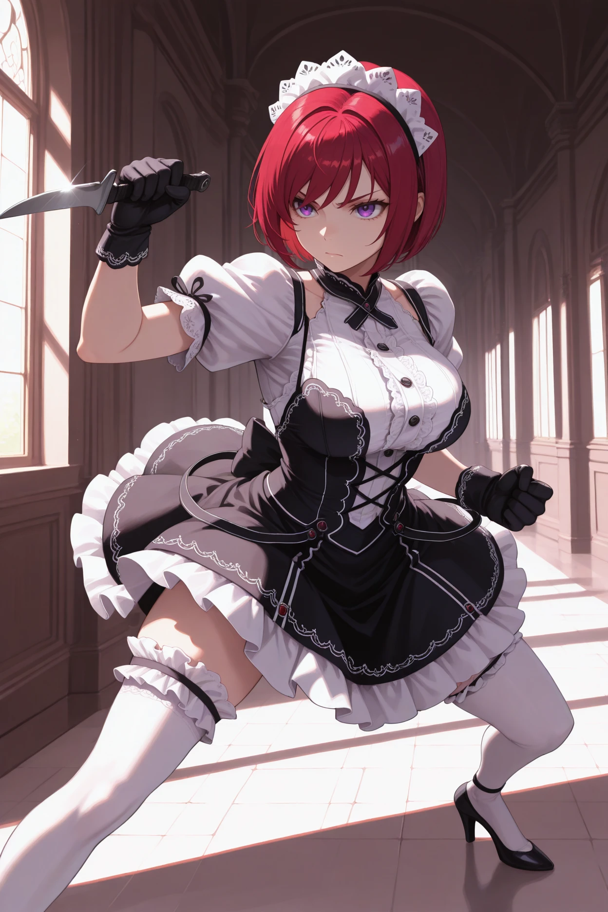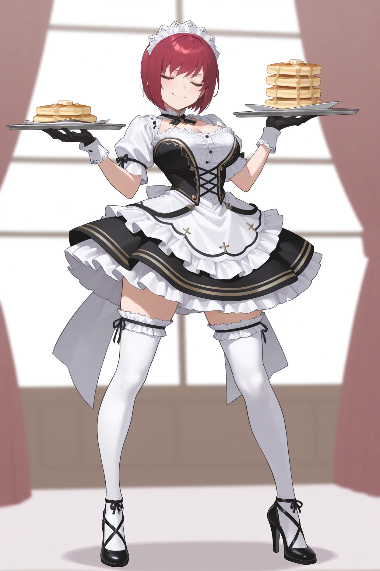 Add "maid headdress, maid dress, cross-laced dress, frills, white sleeves, puffy short sleeves, black gloves, white thighhighs, frilled thighhighs, high heels" for her Anamnesis maid outfit.