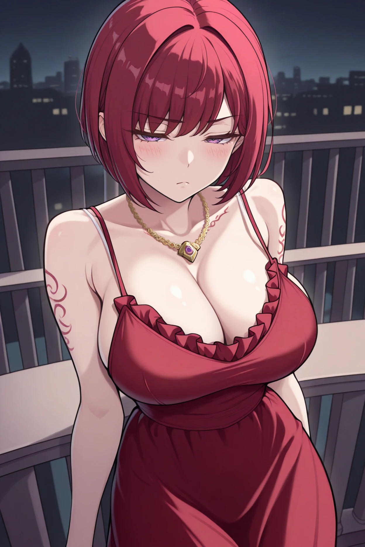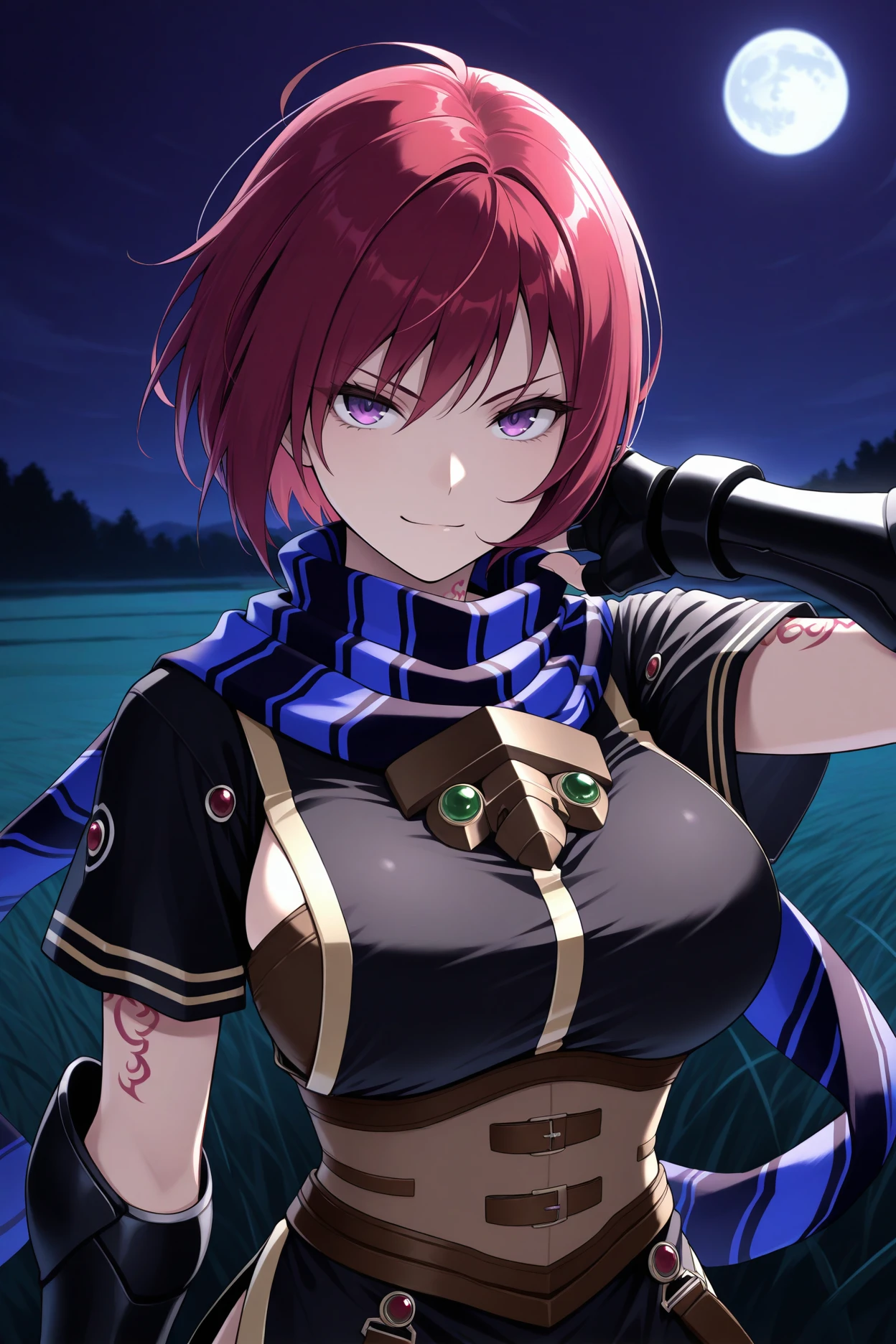 Trigger word is "son3l" and "red hair, short hair, purple eyes, leg tattoo, arm tattoo" is required.