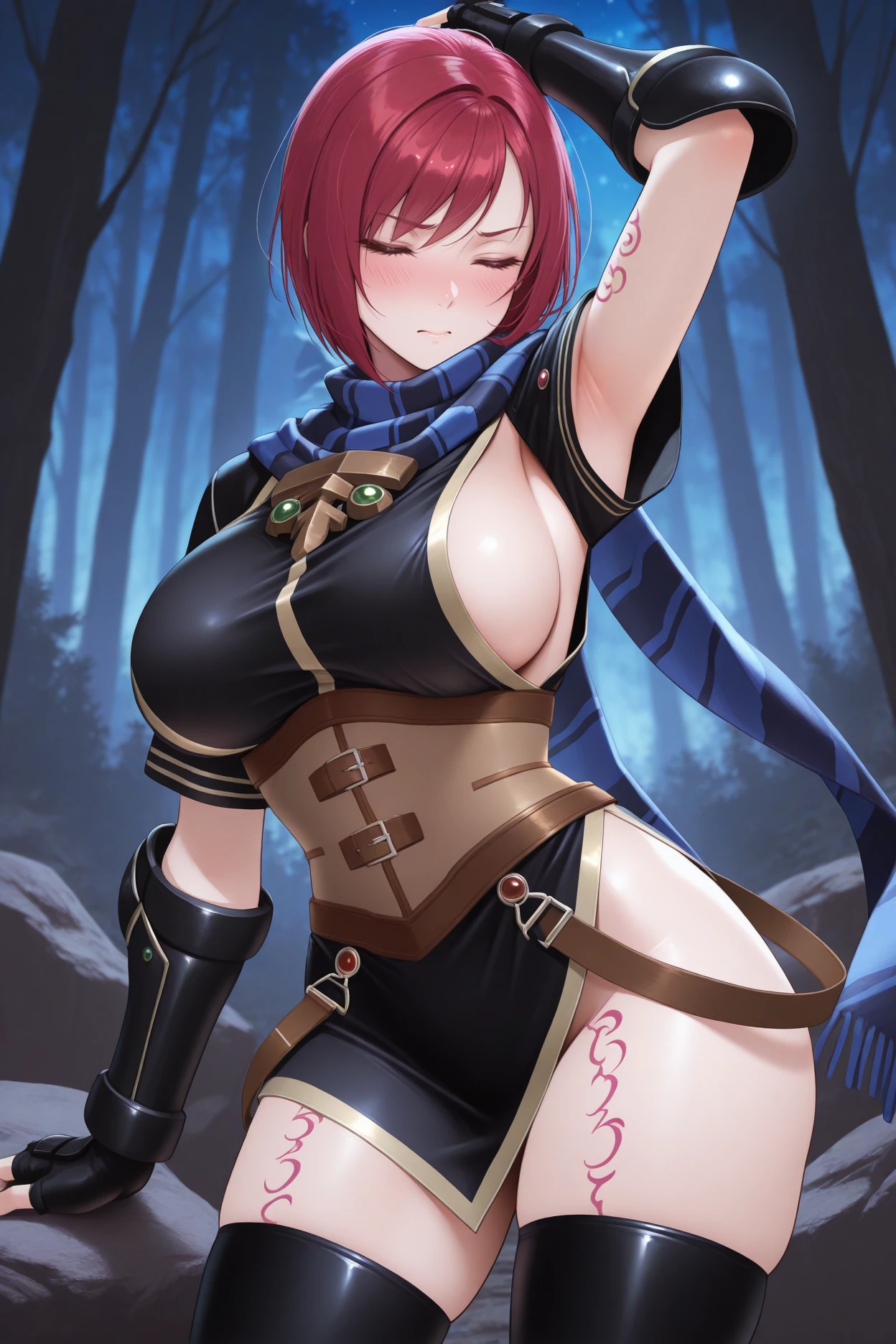 Add "blue scarf, striped scarf, brown corset, black tunic, short sleeves, brooch, black gloves, fingerless gloves, vambraces, black thigh boots" for her regular look.