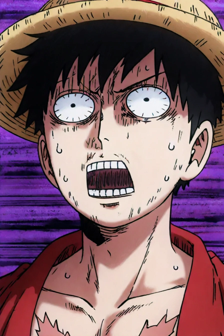 prompt 1 : mob_psycho_funny_face, open mouth, snot, exaggerated expression, impact lines, teeth, sweat, meme, parody, Distorted purple background