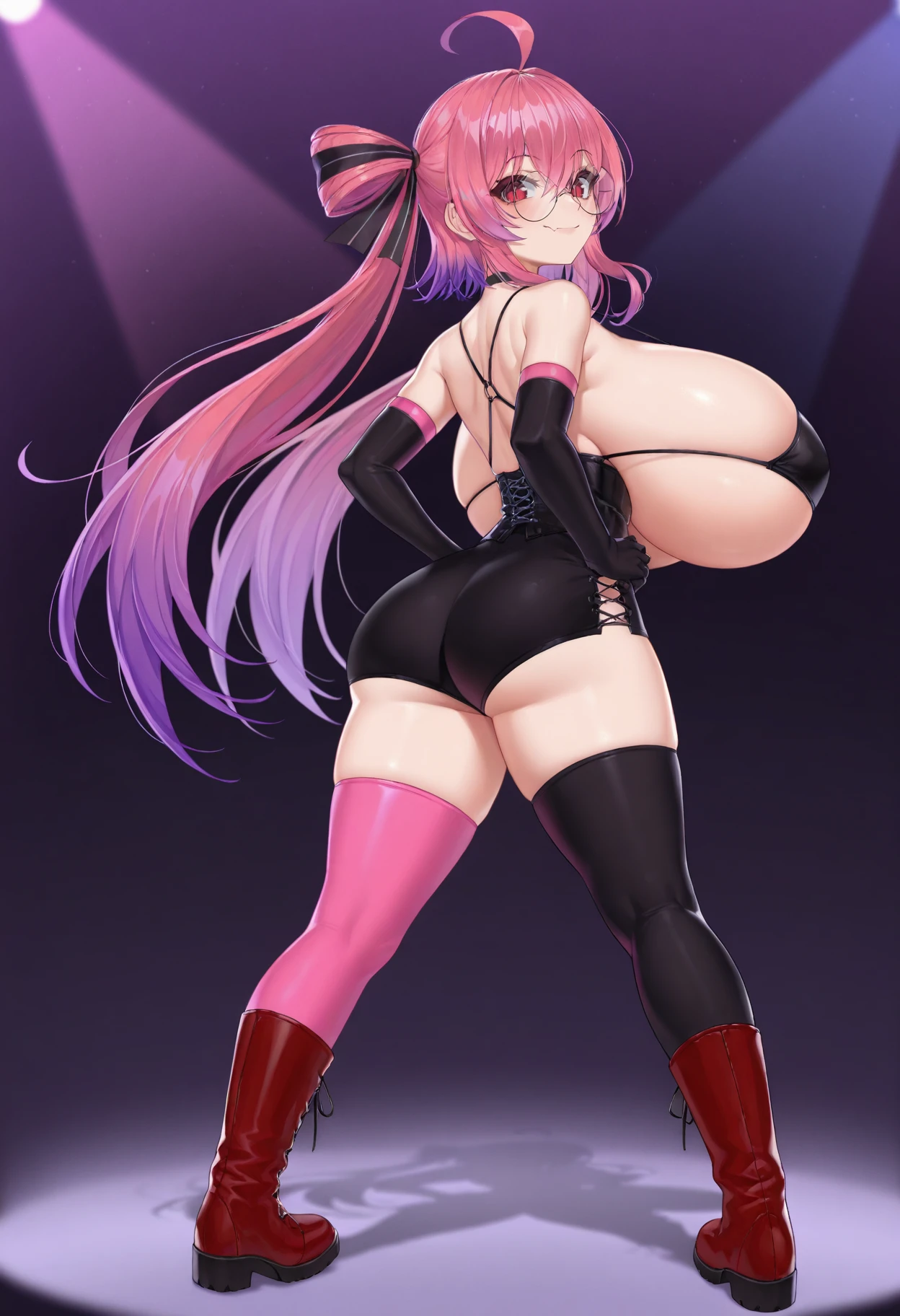 3mbl4, ahoge, black thighhigh, pink thighhigh, boots, choker, elbow gloves, gigantic breasts, hair between eyes, hair ornament, hair ribbon, huge breasts, long hair, mismatched legwear, multicolored hair, pink hair, red eyes, red footwear, round eyewear, shortstack, sidelocks, simple background, skin fang, slit pupils, smile, standing, twintails, big glasses, round eyewear, pointy ears, tsurime, big eyes