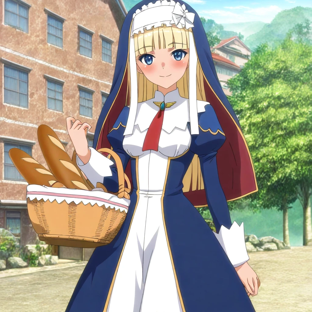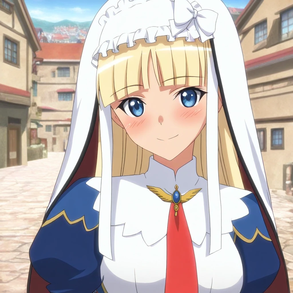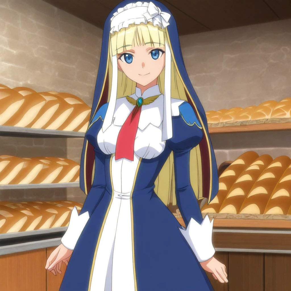 blonde hair, long hair, hime-cut bangs, blue eyes, breasts,