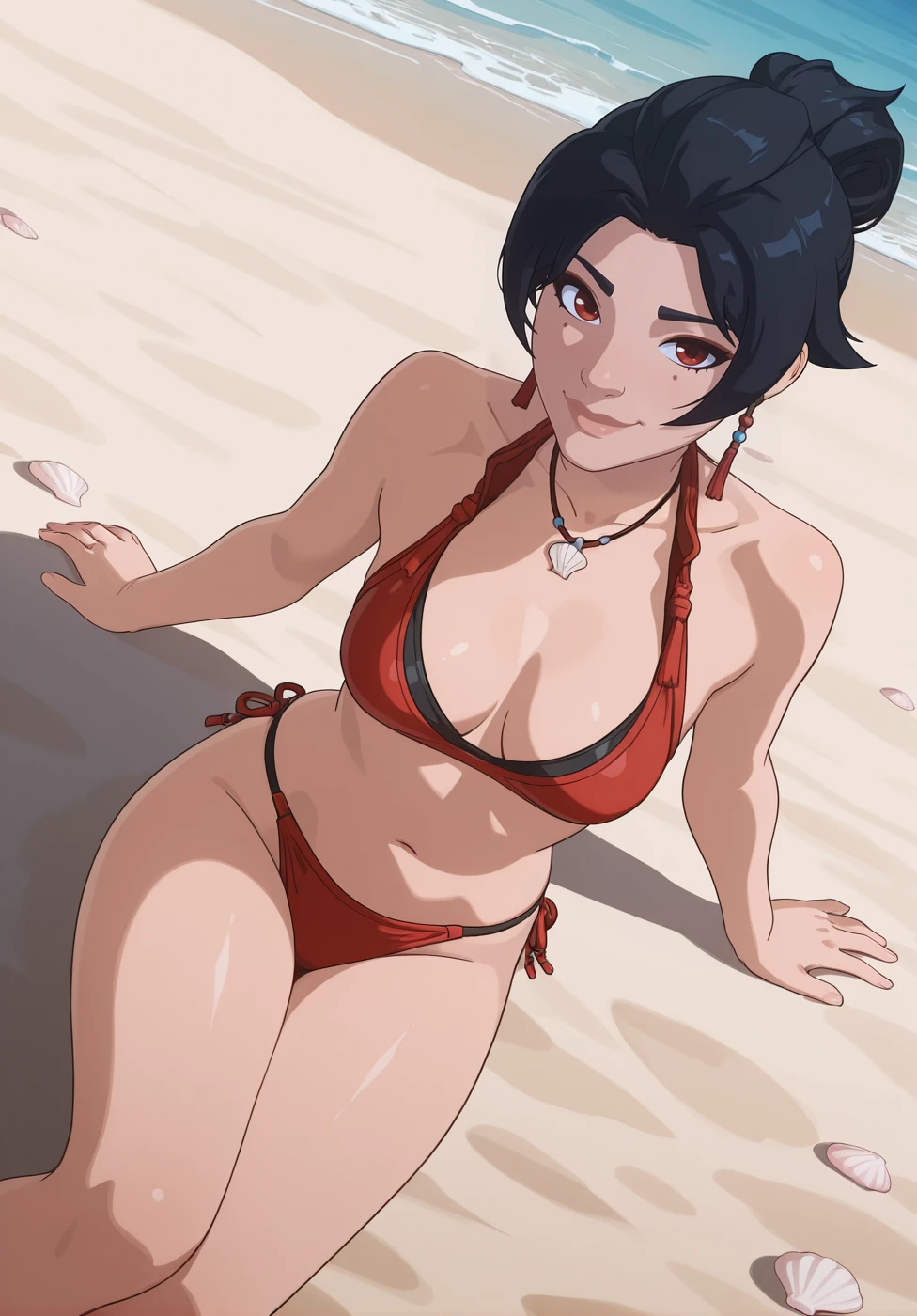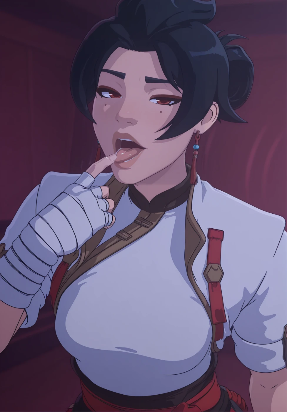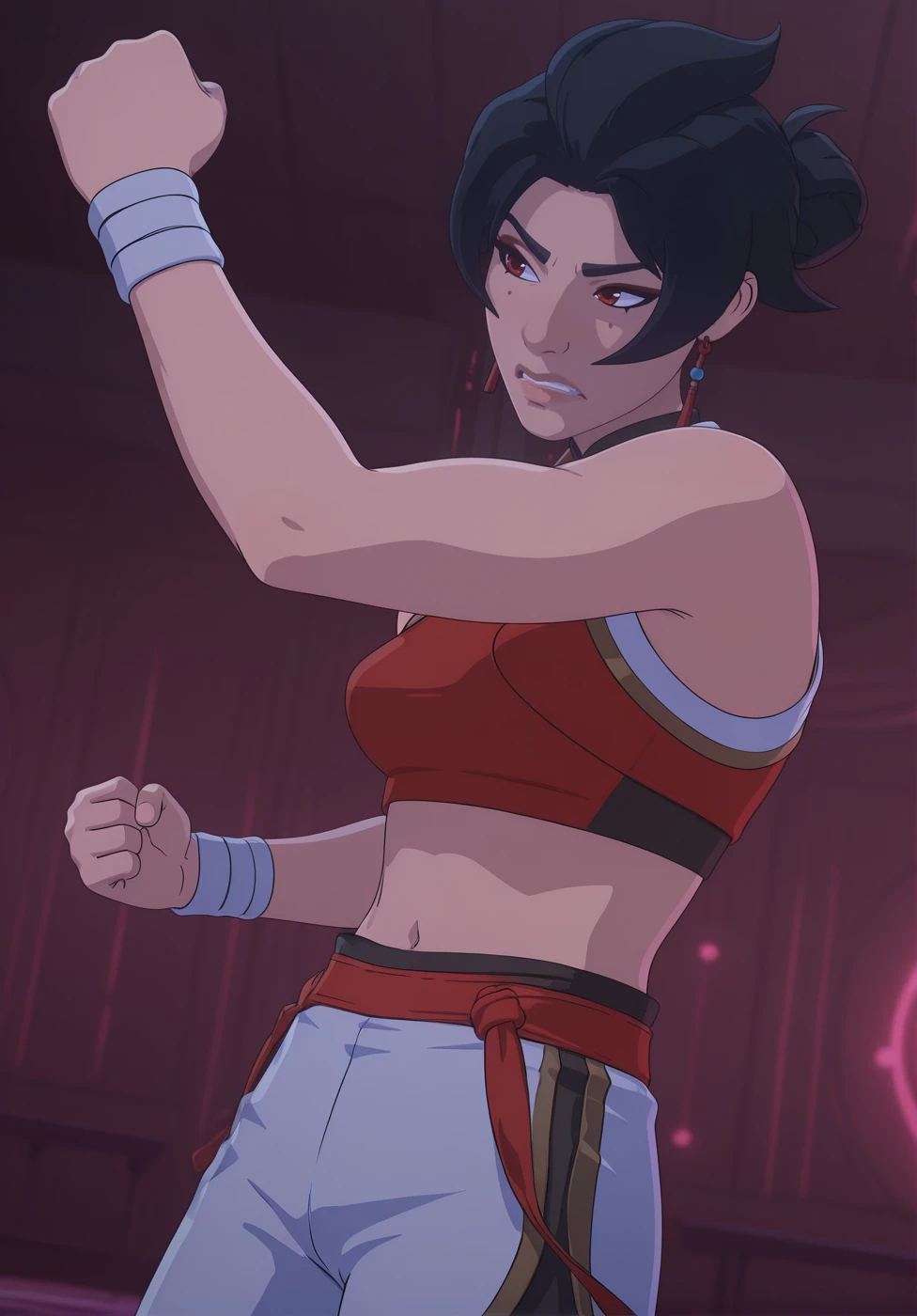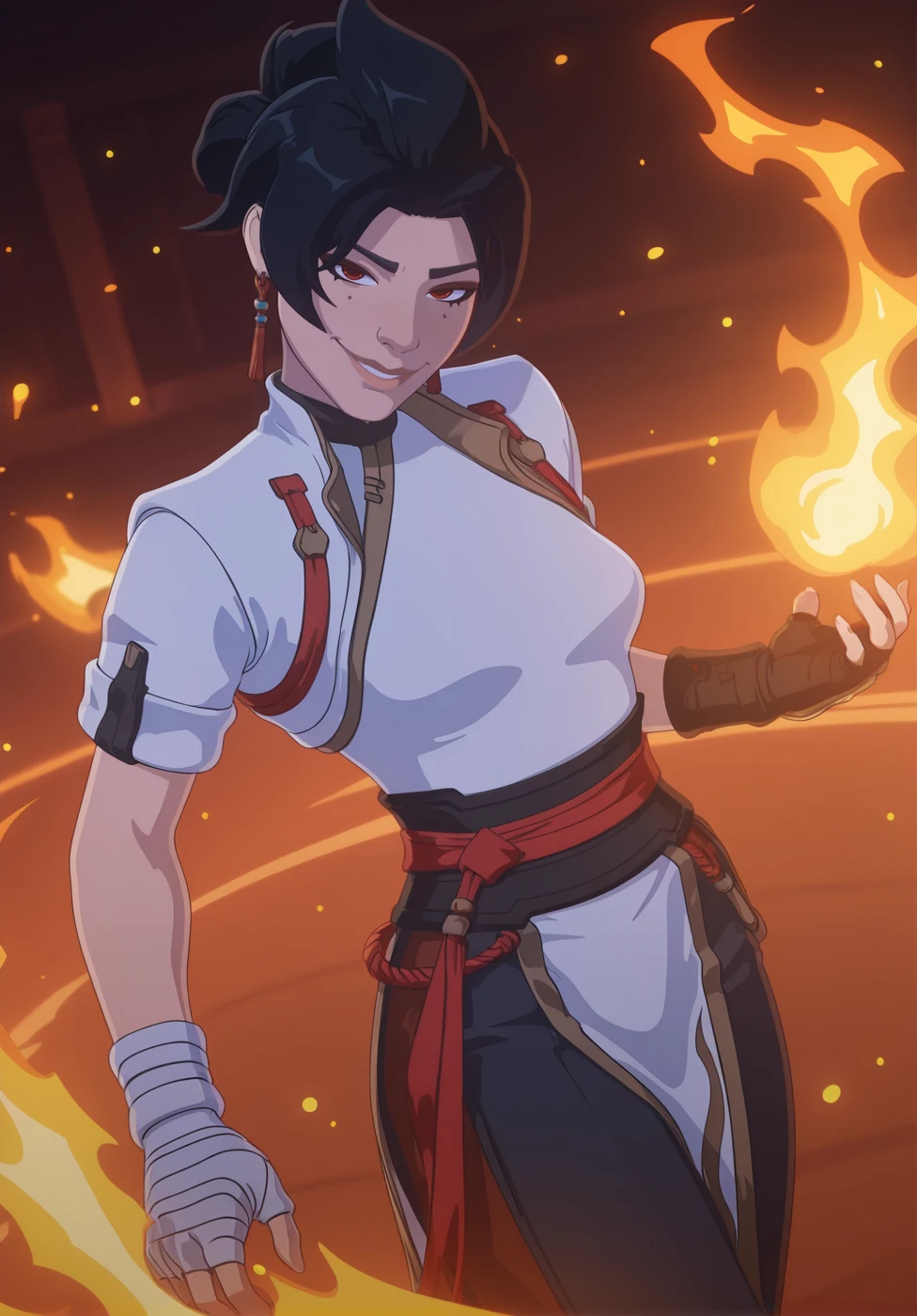 1girl, sis4nr4n, black hair, short hair, bun hair, mole under eye, nose, lips, red eyes, earrings, shirt, medium breasts, cropped jacket, short sleeve, fingerless gloves, rope belt, pants, pelvic curtain, shoes