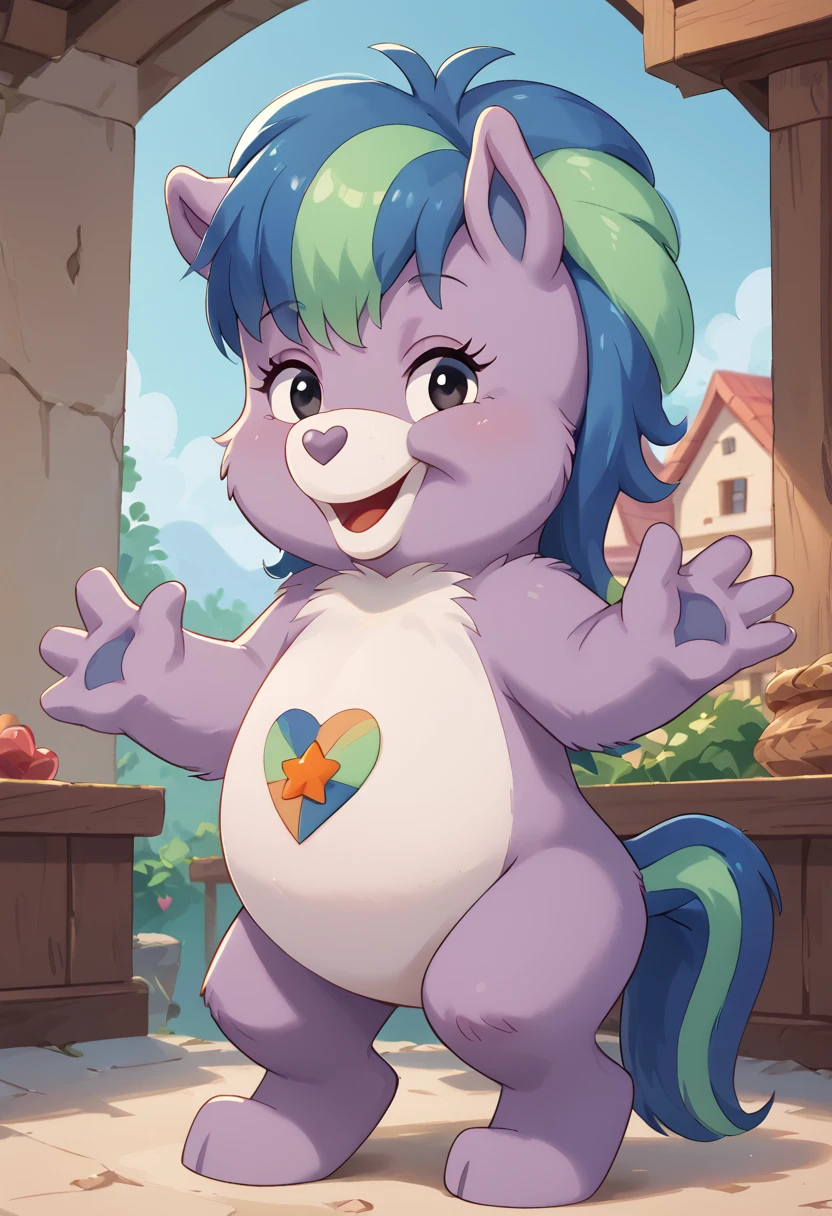 Nobleheart Horse, Care Bear, Belly Badge on chest, two tone body purple and white, black eyes, two color hair purple and yellow, two tone tail purple and yellow,,