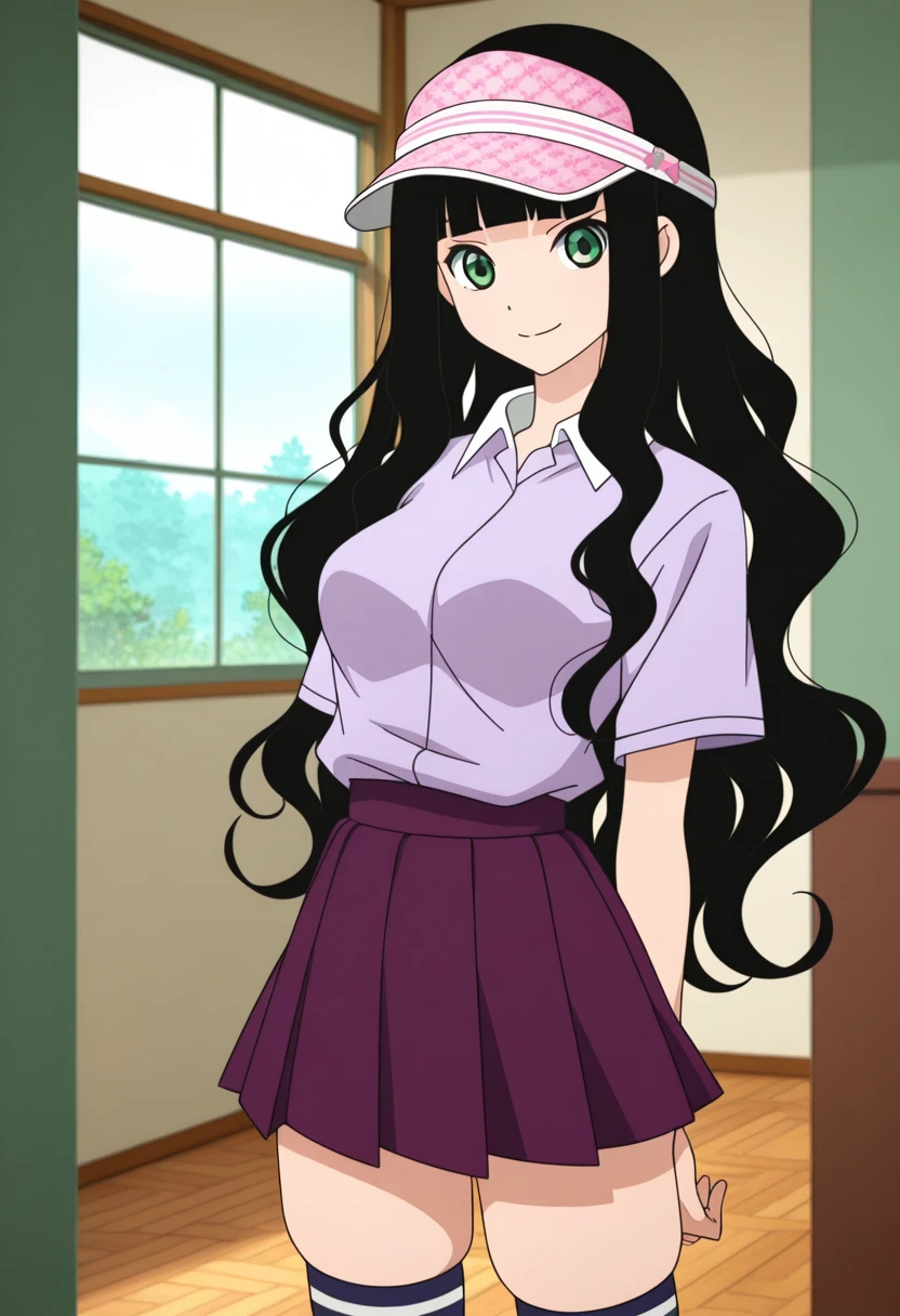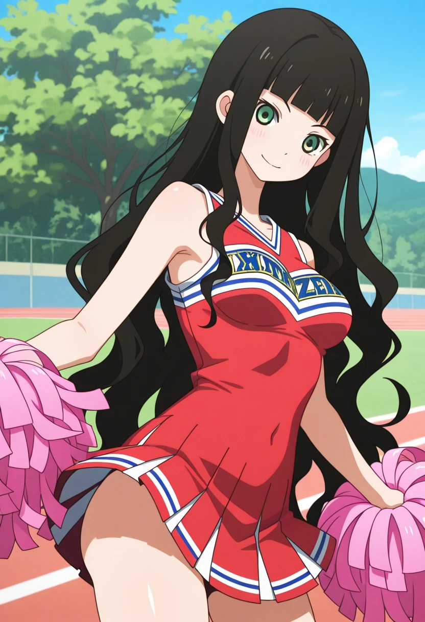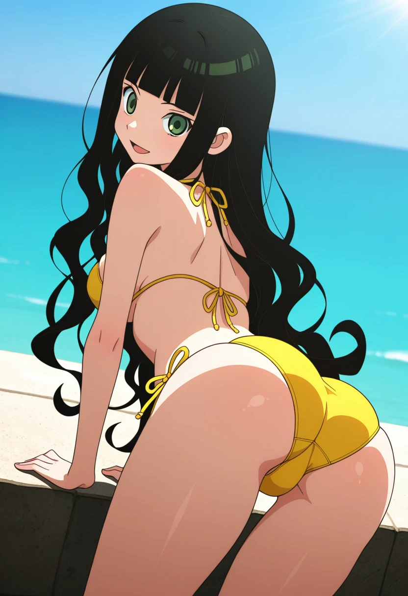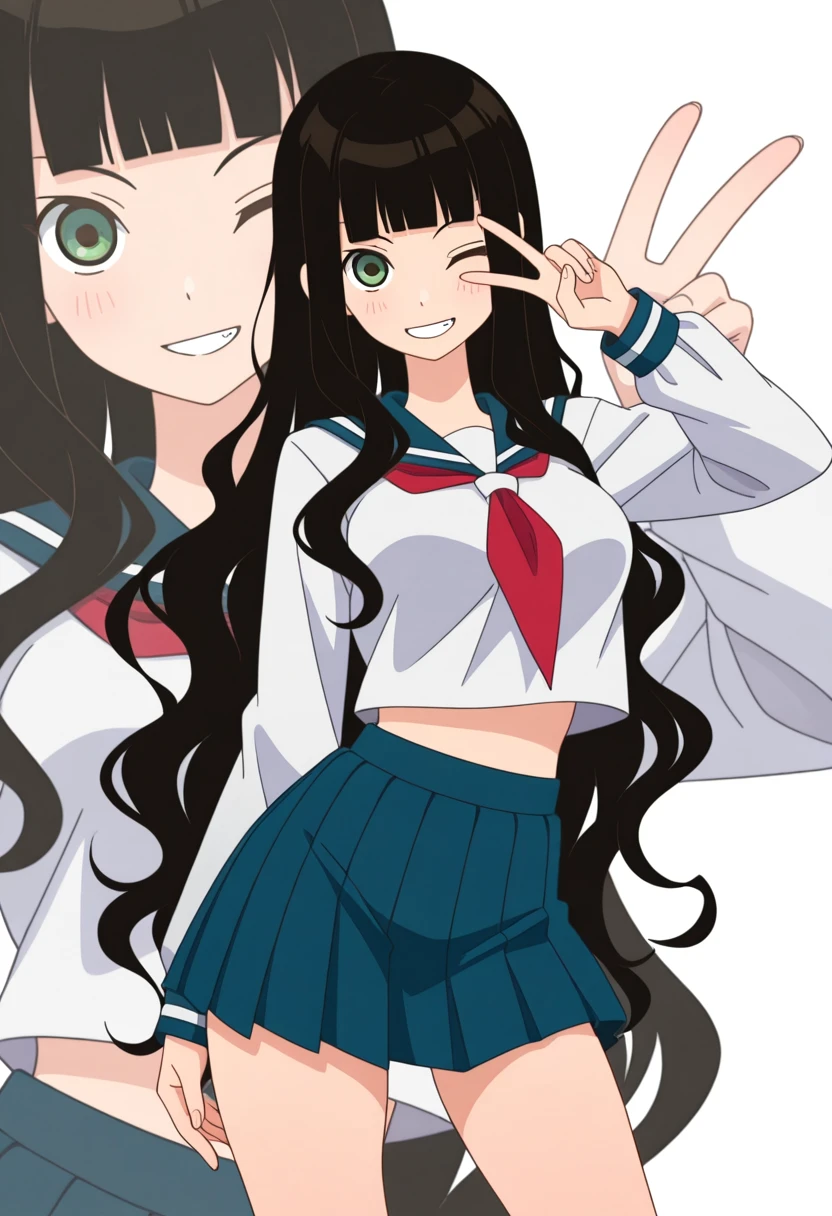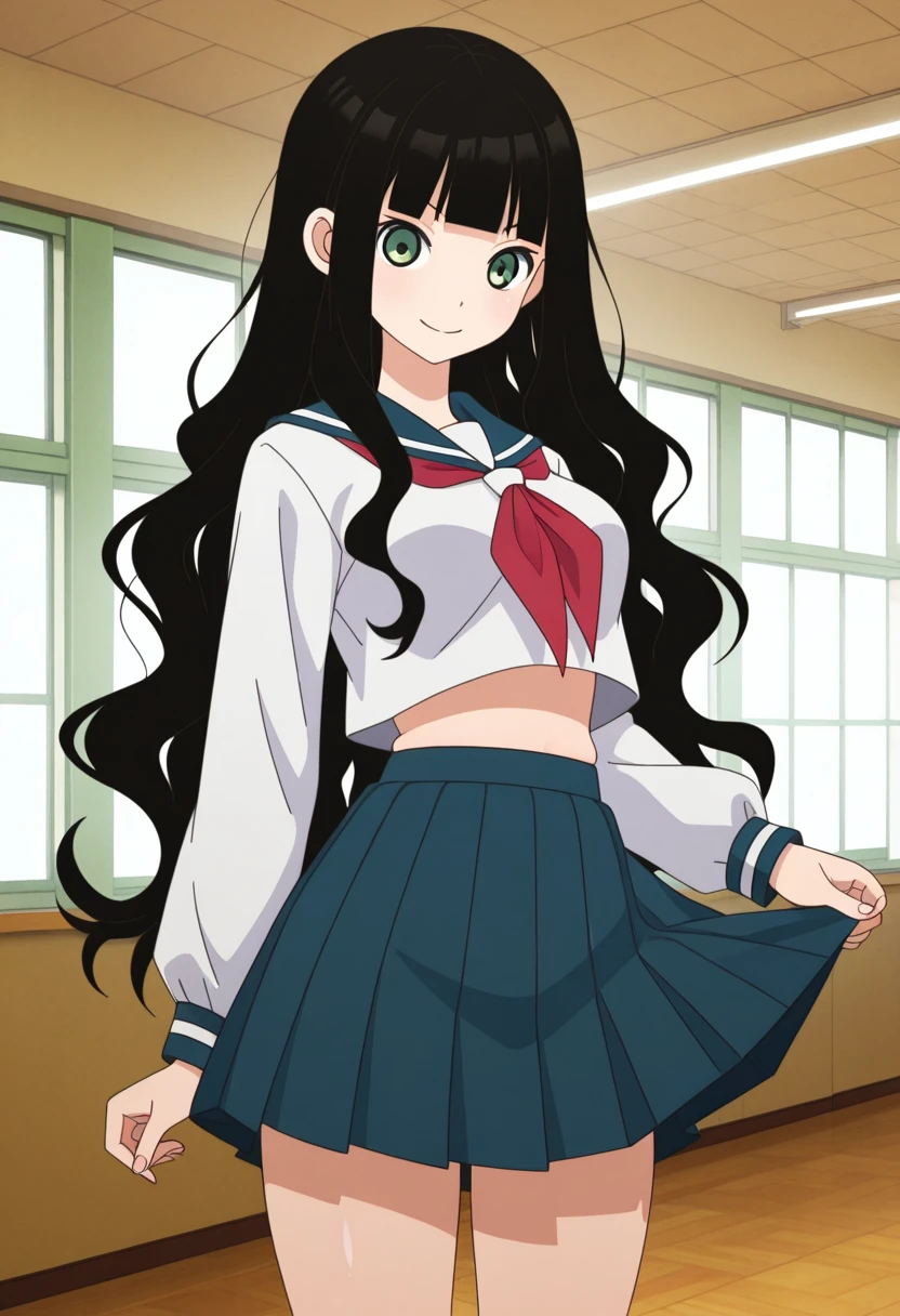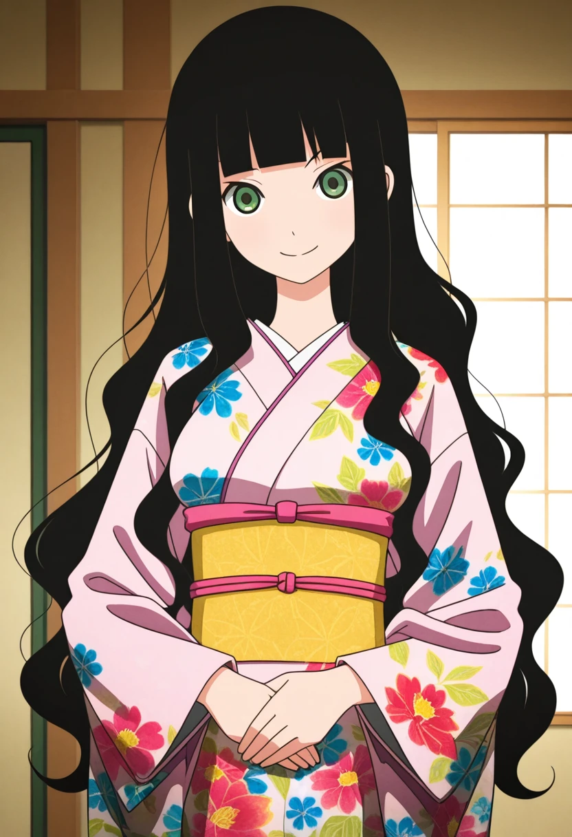 rinww, green eyes, black hair, long hair, very long hair, wavy hair, blunt bangs, medium breasts,