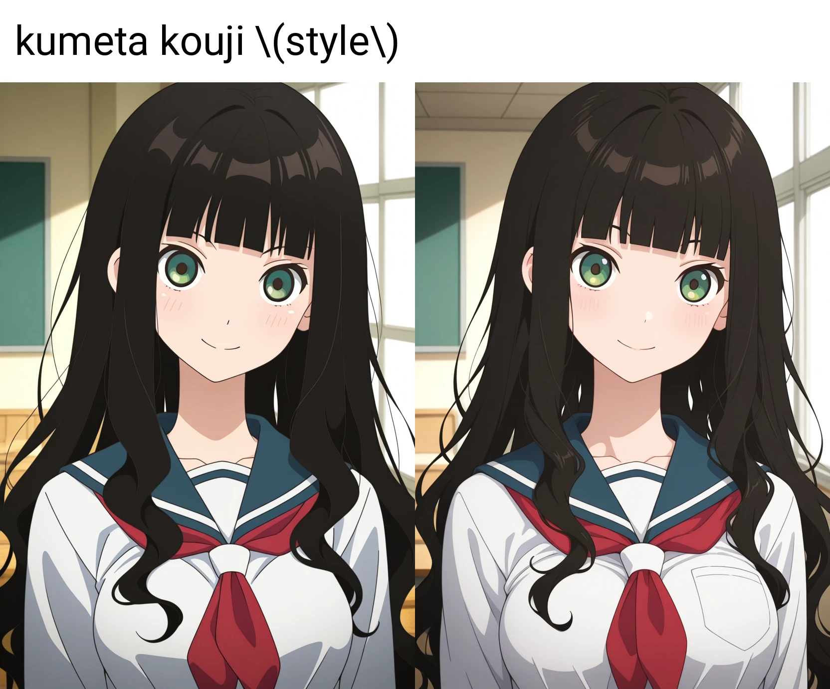プロンプトに"kumeta kouji \(style\)"を追加する方が、再現度が高くなるようです。