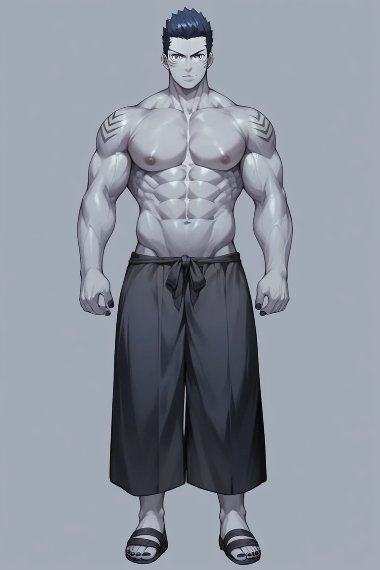 Score_9, Scate_8_up, scate_7_up, anime origin, masculine, adult, kisame, in good physical shape, fur, muscle, dark blue hair, shark eyes, sharp teeth, black tunic, dark blue ninja sandals, dark blue hair, gray skin , Nail polish, blue shorts, standing, standing, full body, looking at the viewer, front view