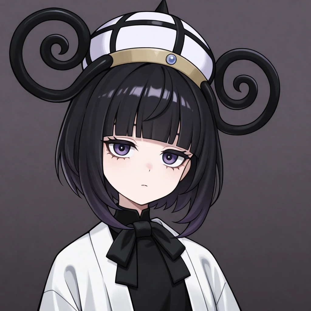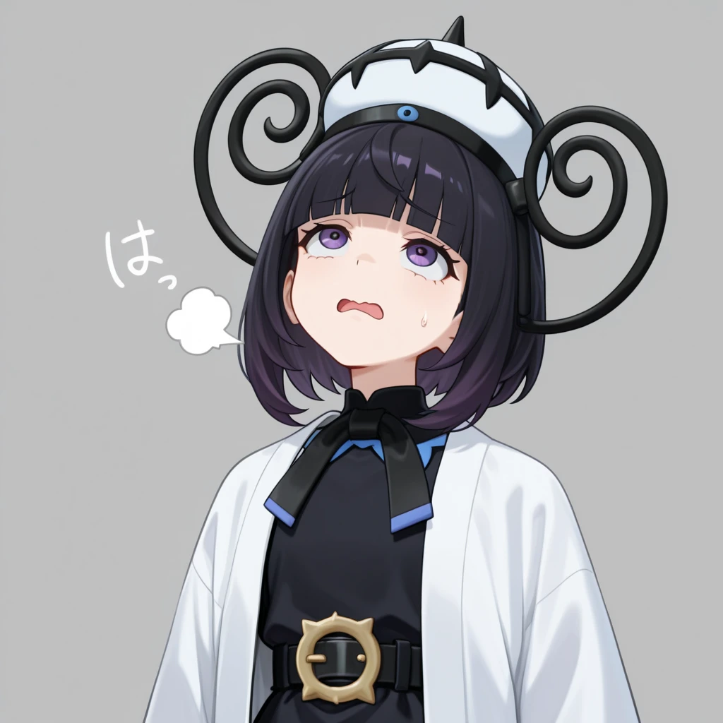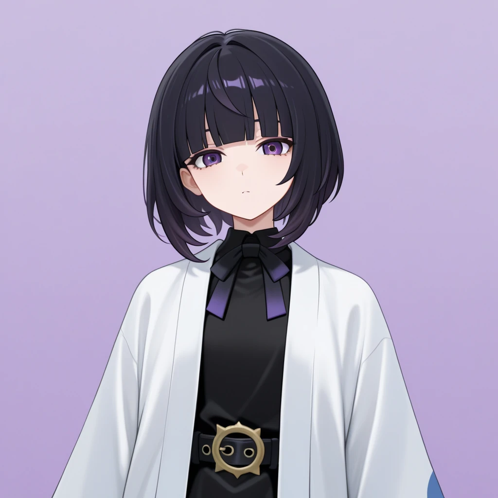 black hair, short hair, bangs, blunt bangs, purple eyes, black dress, white haori, belt, lantern hat
