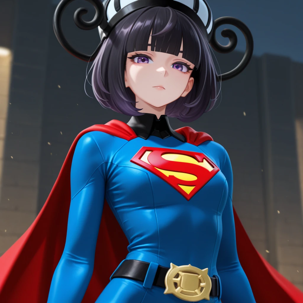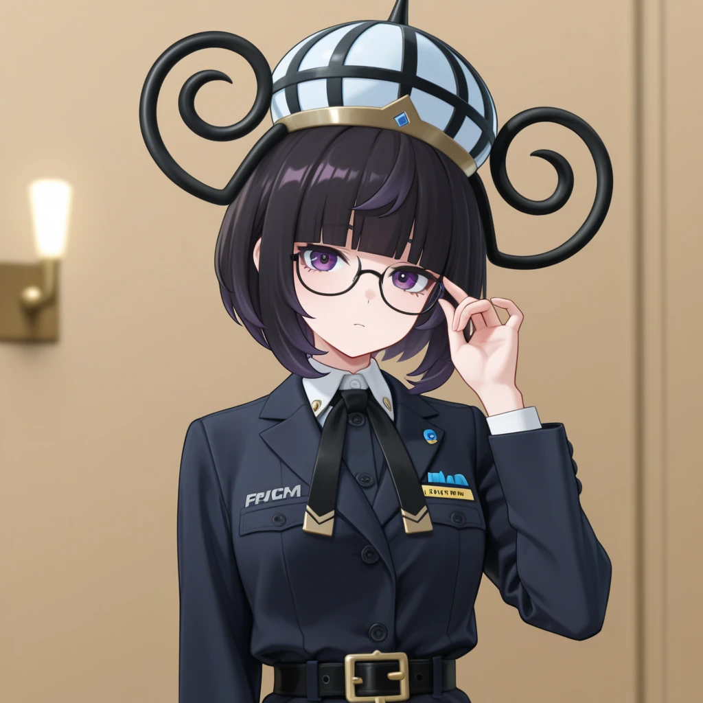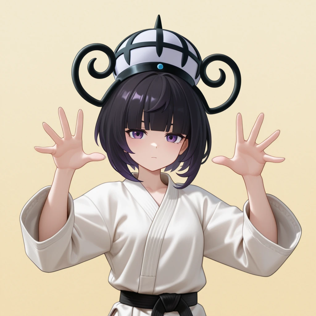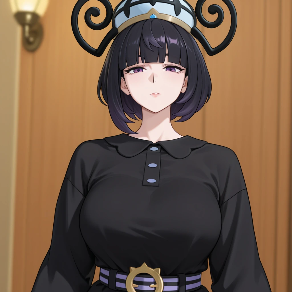 black hair, short hair, bangs, blunt bangs, purple eyes, black dress, white haori, belt, lantern hat