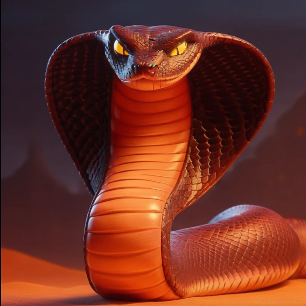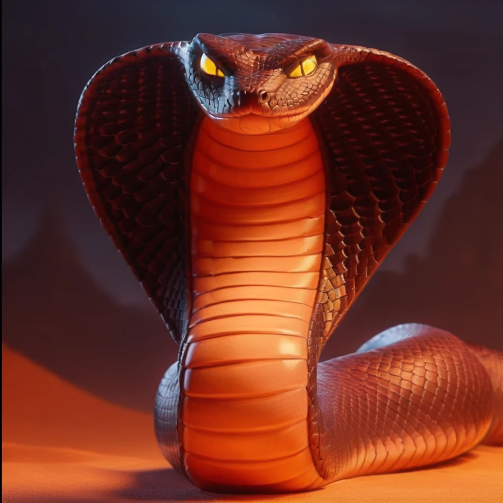 cobra, large snake-hood, semi-realistic, orange sclerals eyes, dark-red body markings long body, identical pupils, , solo, forked tongue, slit pupisl, dark-red body, black-red scales, two tone scales,