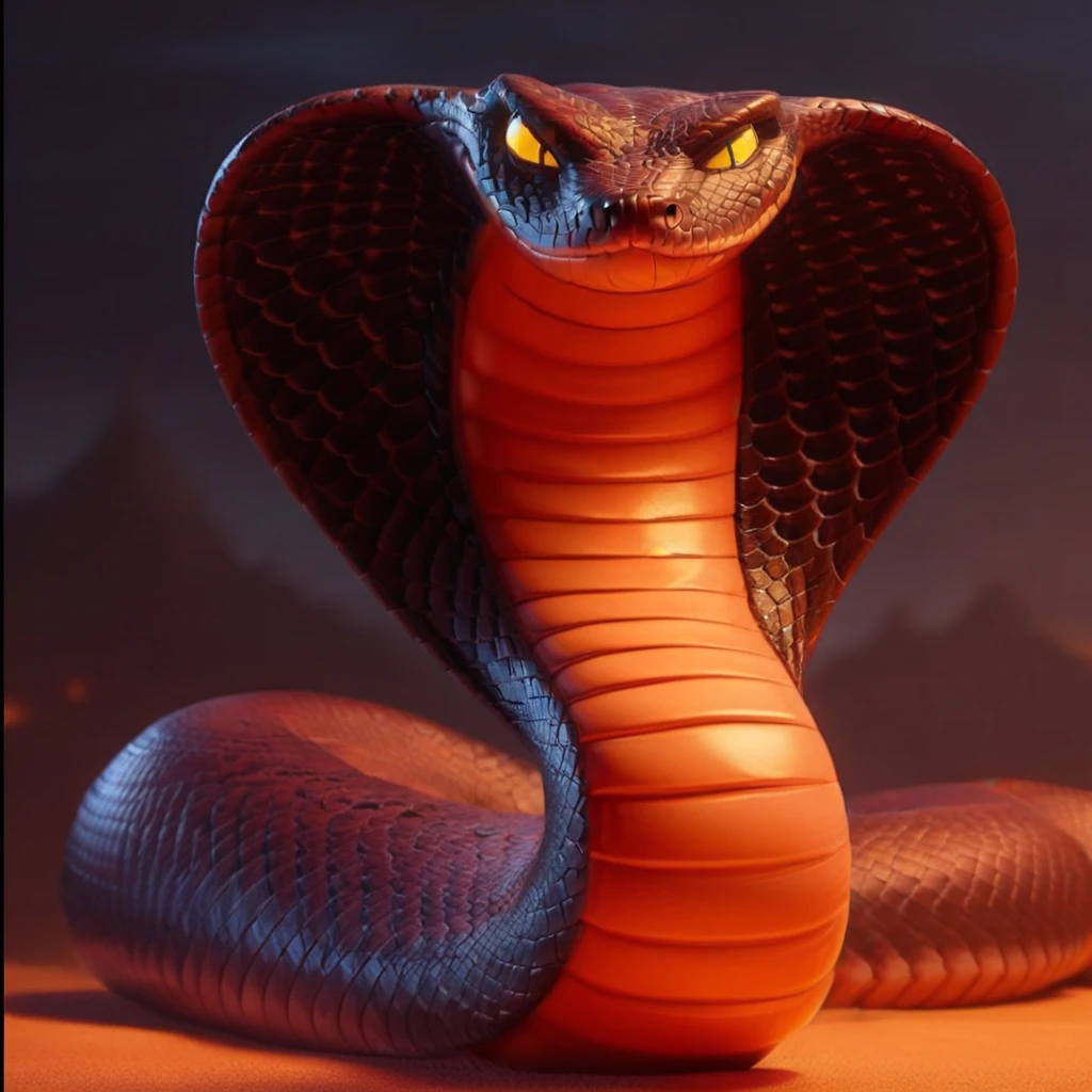 cobra, large snake-hood, semi-realistic, orange sclerals eyes, dark-red body markings long body, identical pupils, different angles body, solo, forked tongue, slit pupisl, dark-red body, black-red scales, two tone scales,