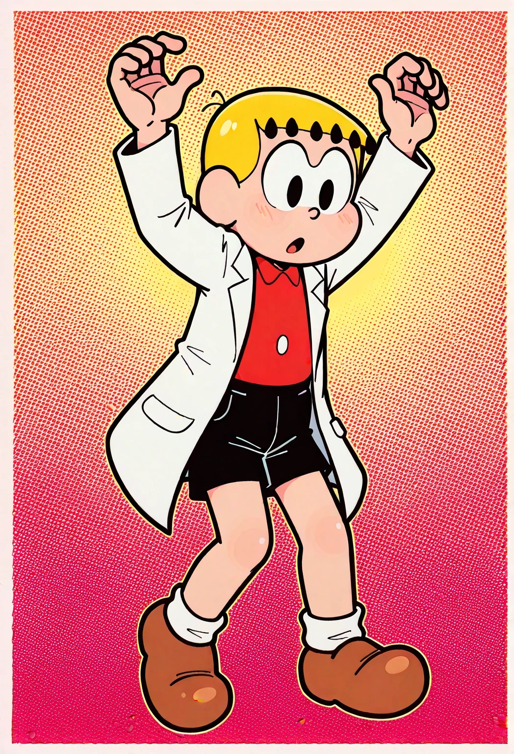 FranjinhaFranklinTDM, 1boy, bright yellow hair with small black tufts, large black expressive eyes, big cartoonish eyes, oval shaped eyes, red collared shirt, black shorts, white socks, brown shoes, short, chibi, white labcoat,