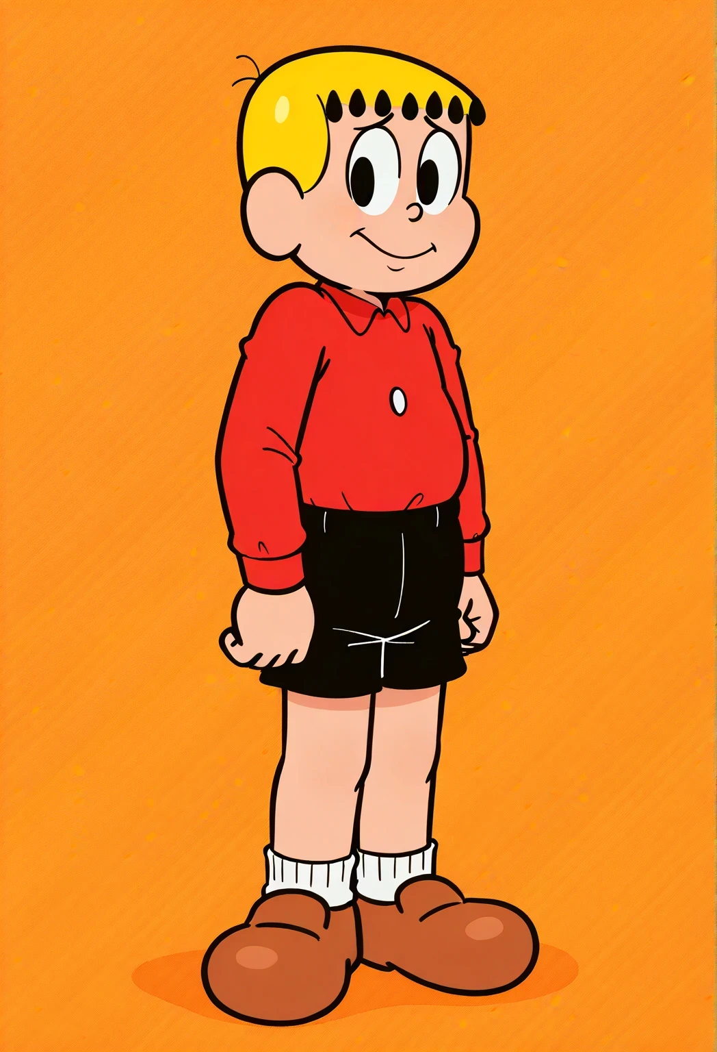 FranjinhaFranklinTDM, 1boy, bright yellow hair with small black tufts, large black expressive eyes, big cartoonish eyes, oval shaped eyes, red collared shirt, black shorts, white socks, brown shoes, short, chibi