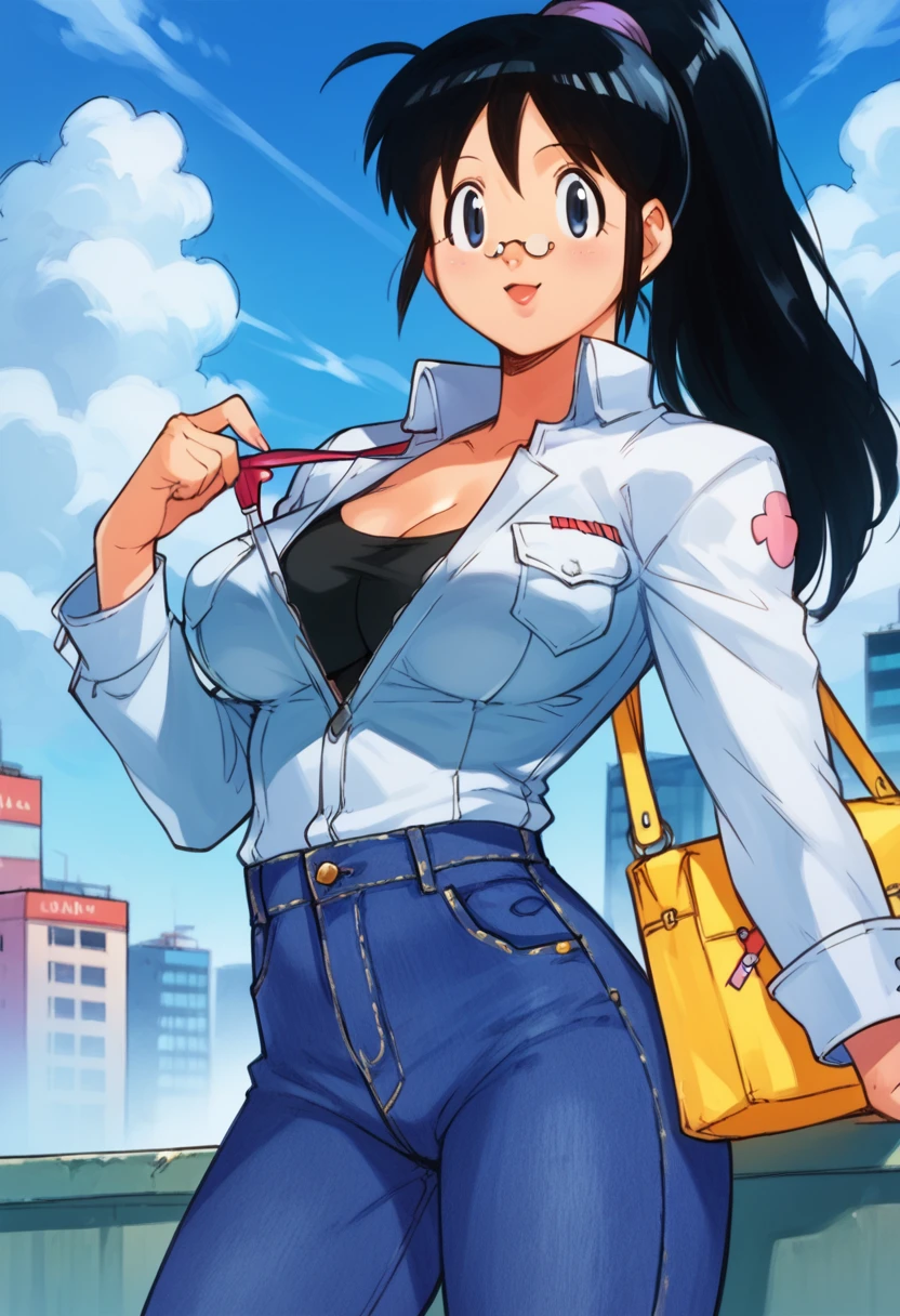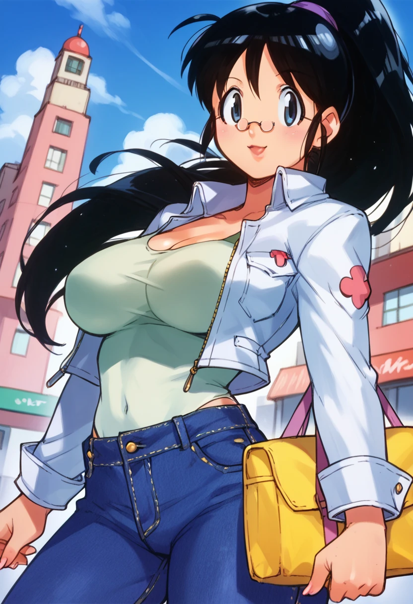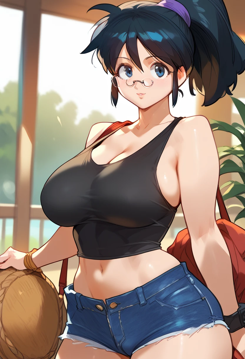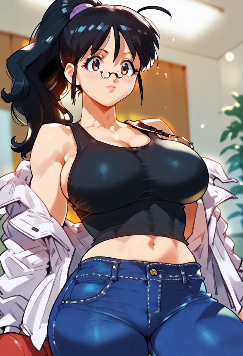 hinata aki, black hair, ponytail, glasses, big breasts