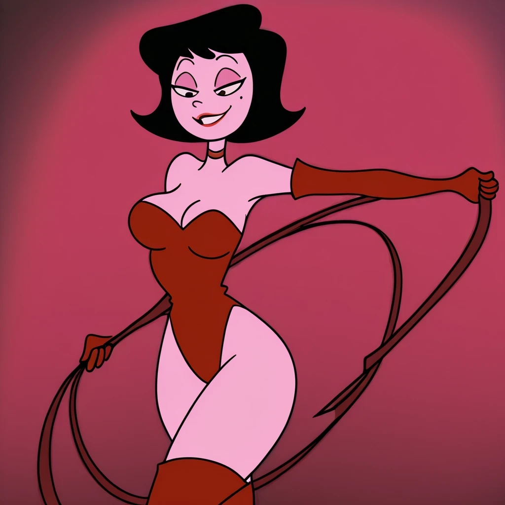 mistress-black hair, short hair, pink skin tone, curvy body, long legs,red chocker, red leotard, red high boots, red elbow gloves.Mother-blue hair, short hair, blue skin tone, curvy body, long legs,black fishnet stockings, black bra, high heels, blue earrings, blue bow.