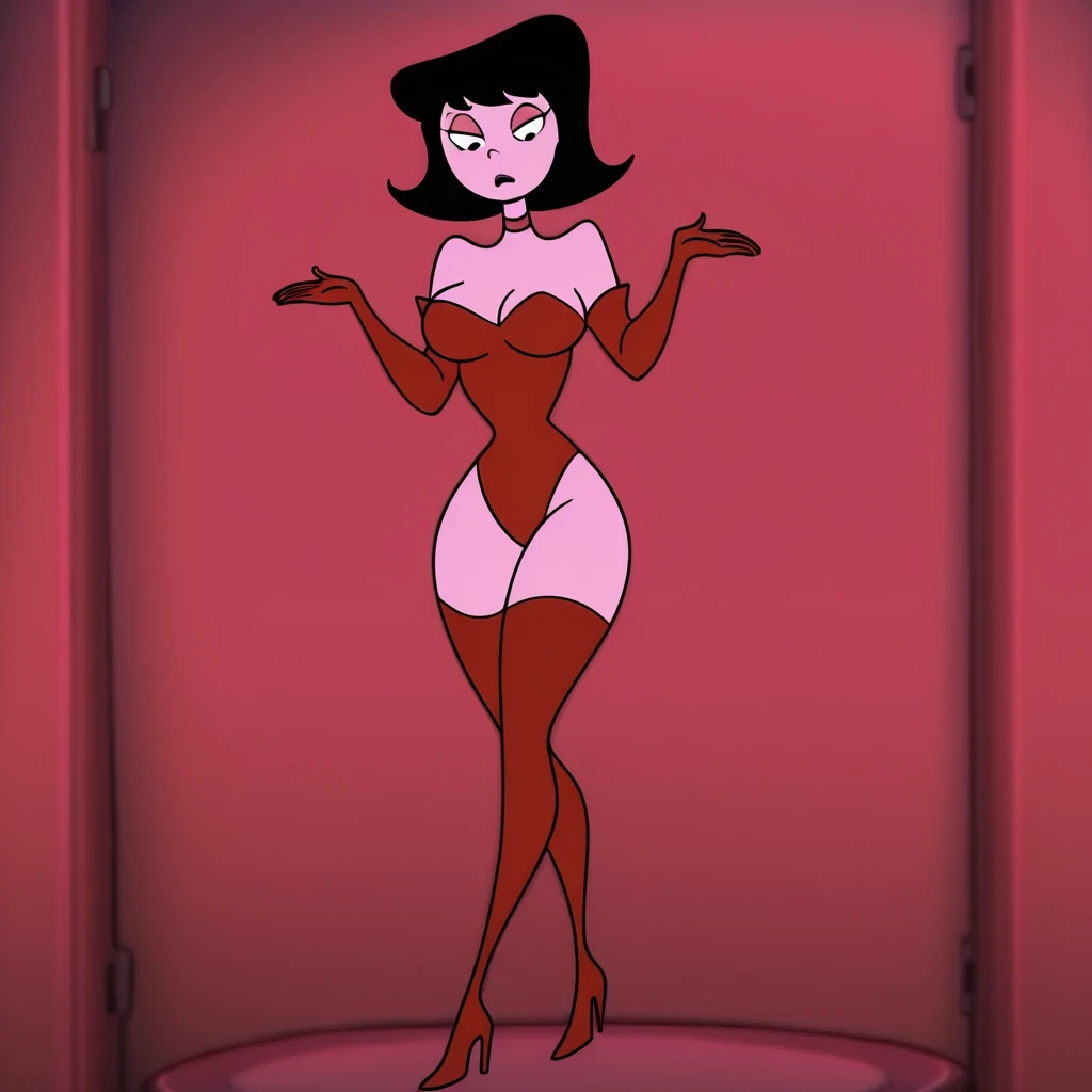 Jennifer-dark hair, short hair, opened mouth, purple skin tone, curvy body,chocker, purple leotard, elbow gloves, tights.