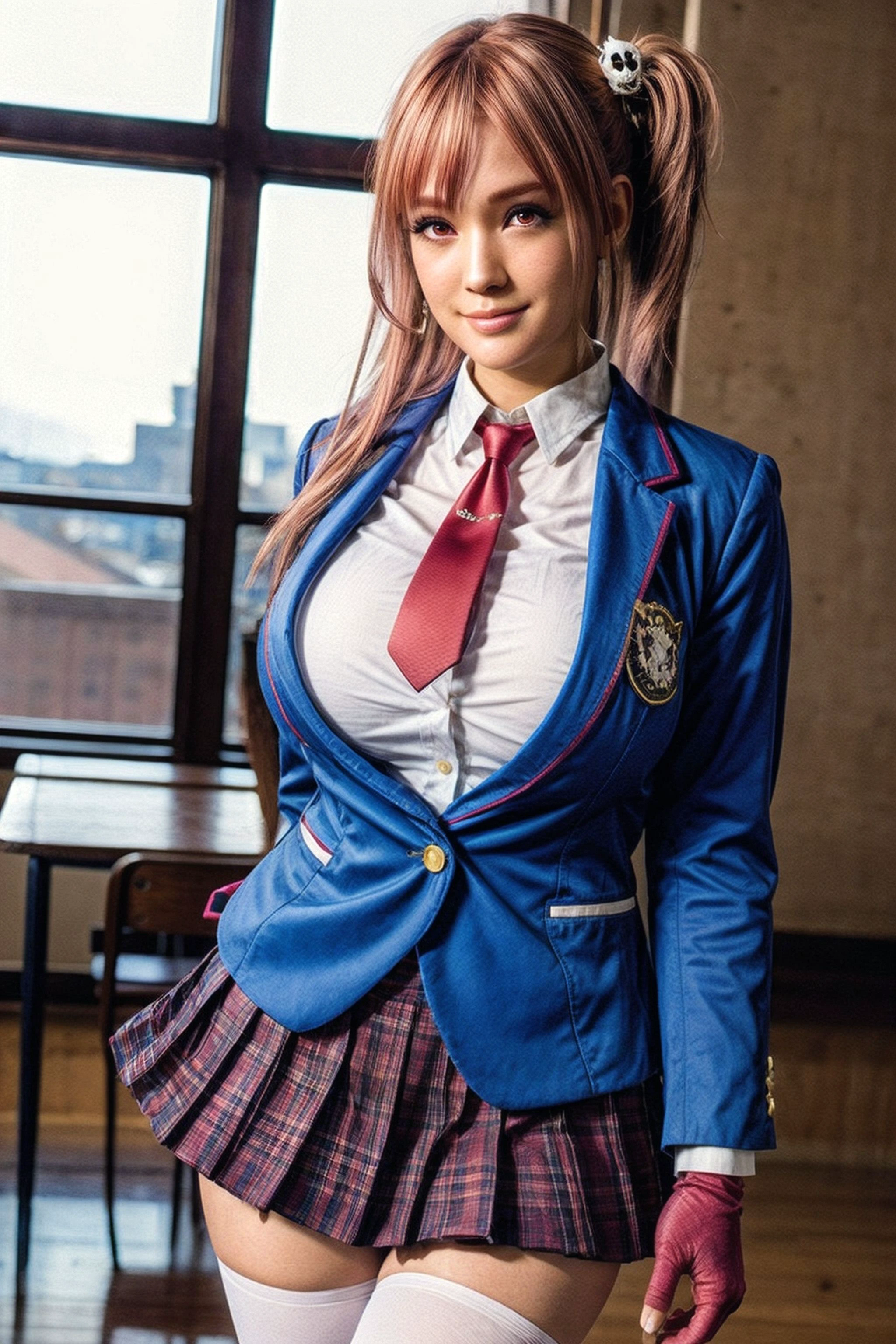 Positive prompt : LORA, realistic, masterpiece, detailed, 8k, beautiful photography of honoka, blue blazer, tie, pleated skirt, red eyes, pink hair, long hair, side ponytail, skull hair ornament, school uniform, single glove, red necktie,blazer, white thighhighs, upper body shot,...