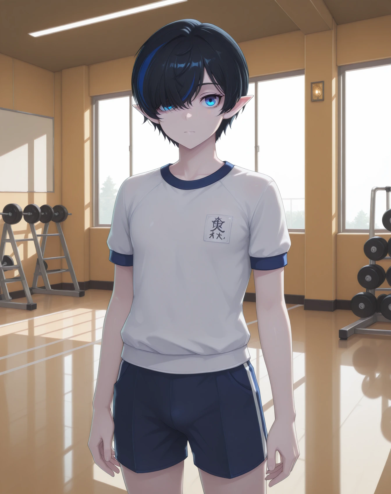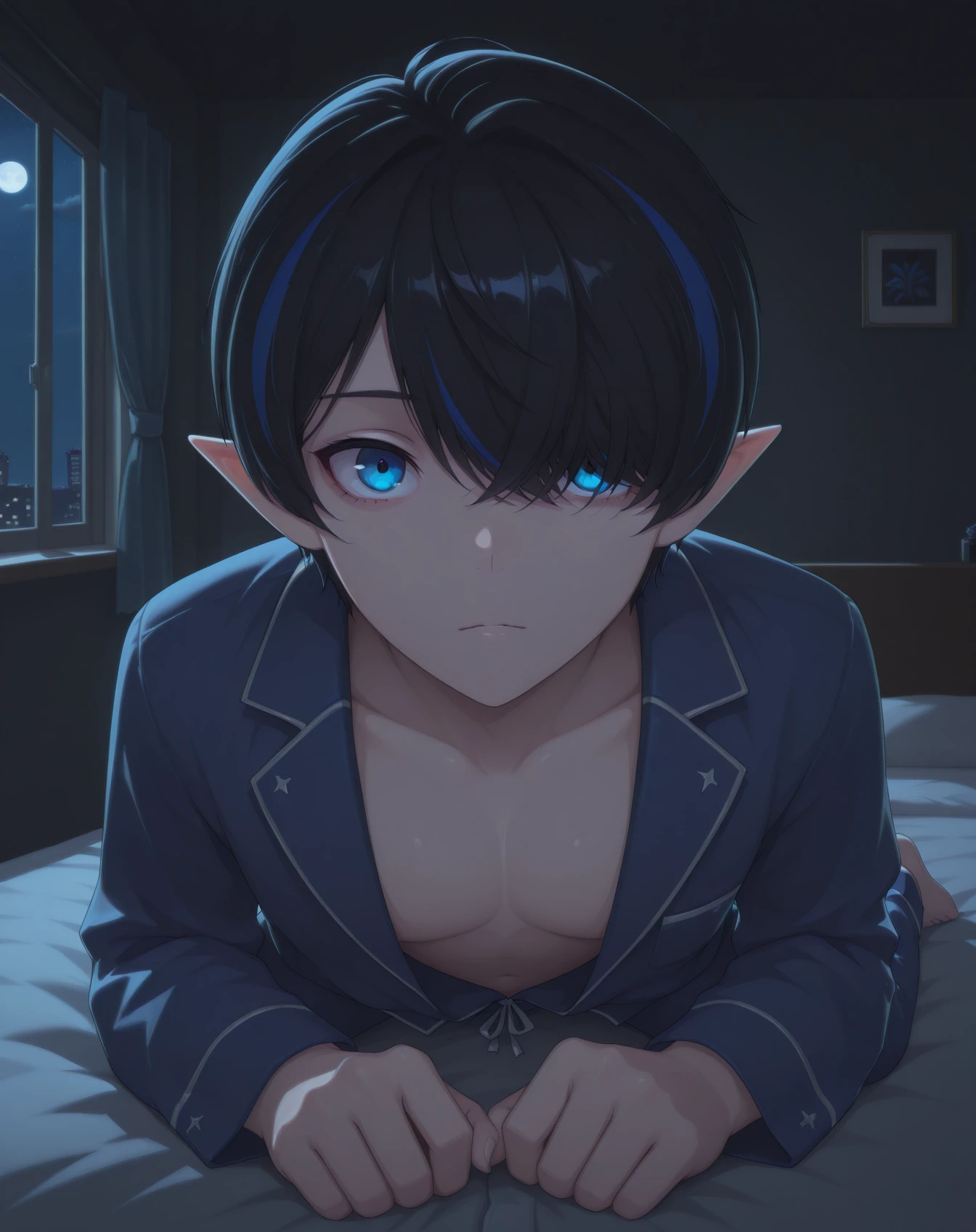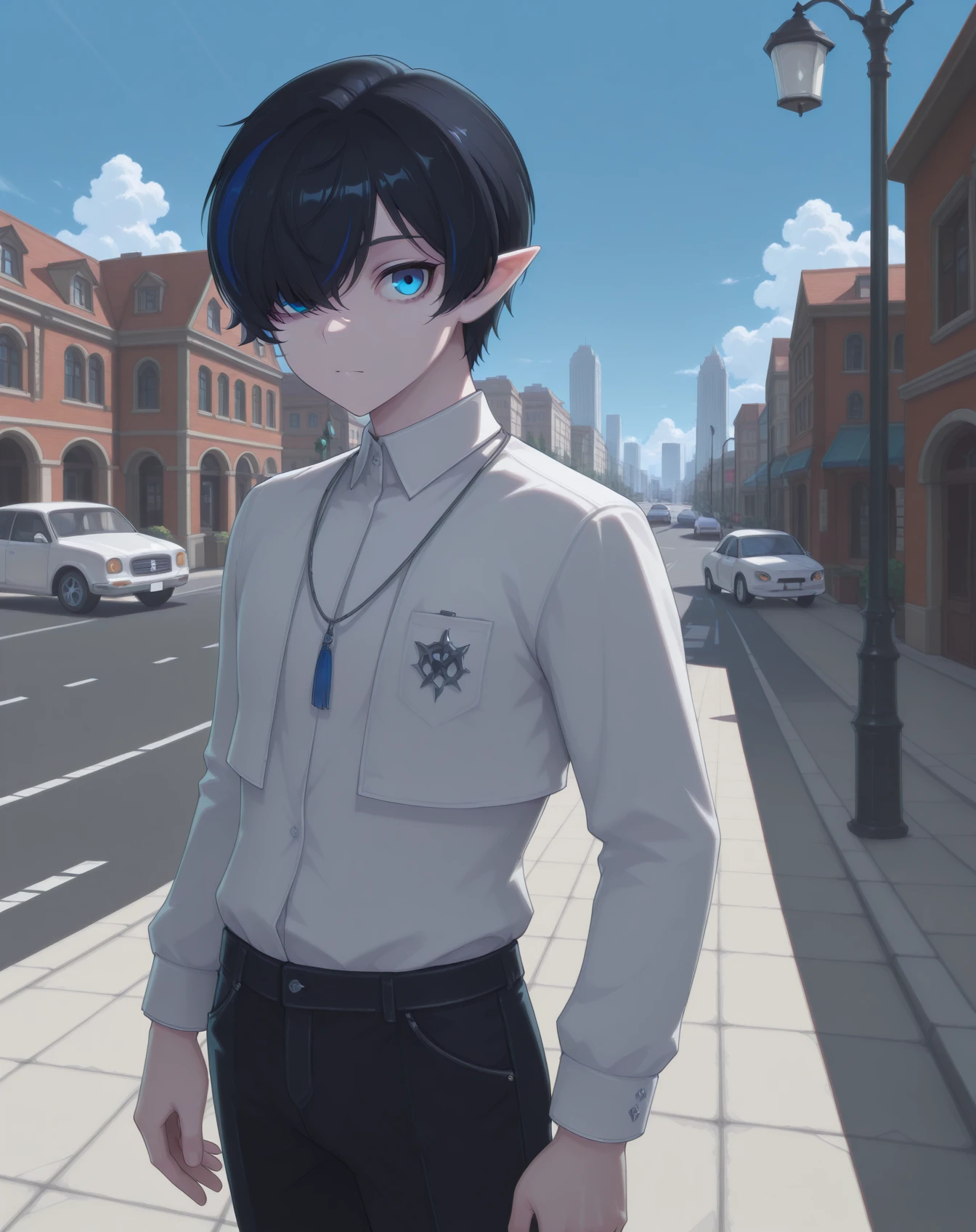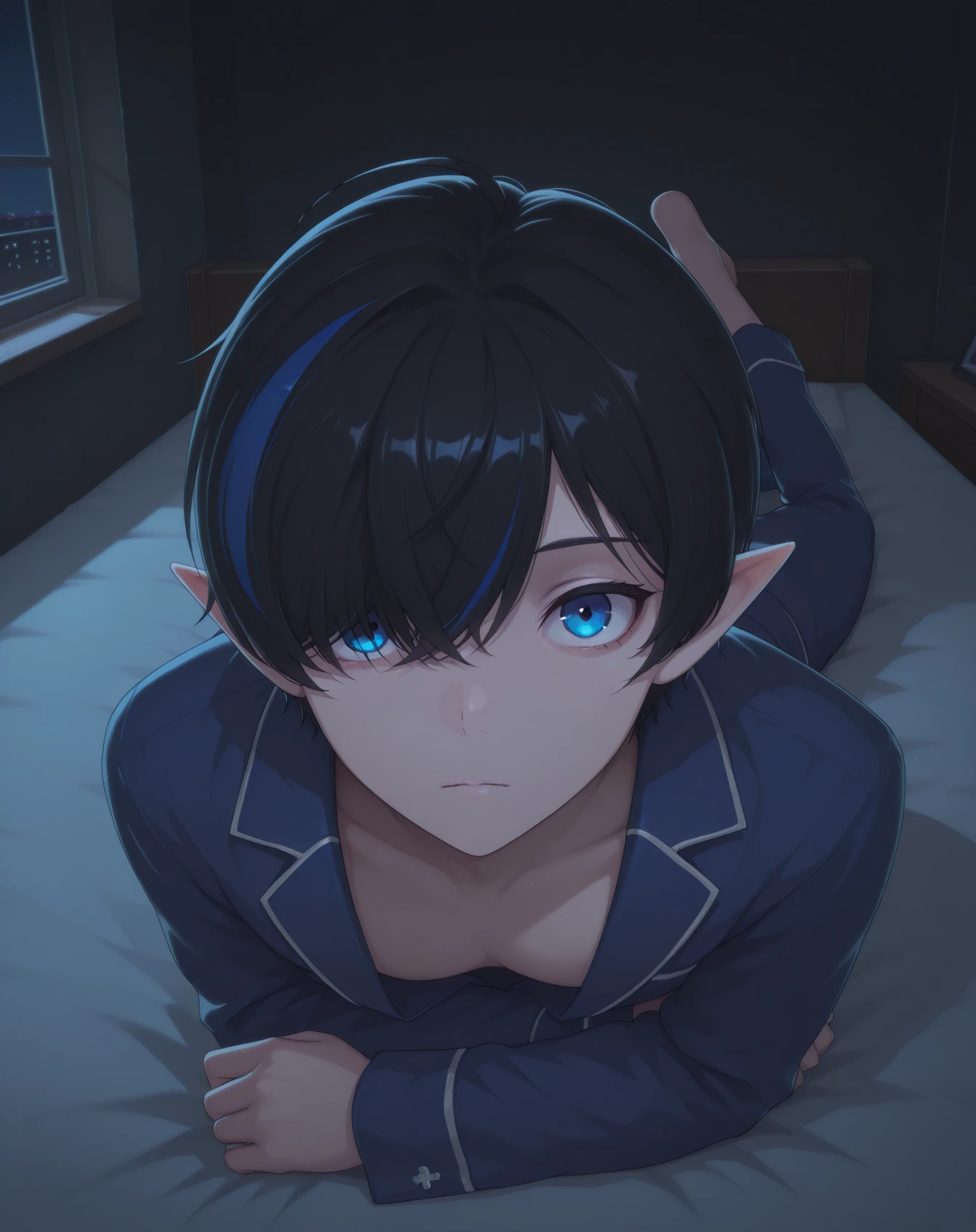 bergamot, black hair, blue eyes, multicolored hair, pointy ears, blue hair, streaked hair, hair over one eye, short hair,pale skin,